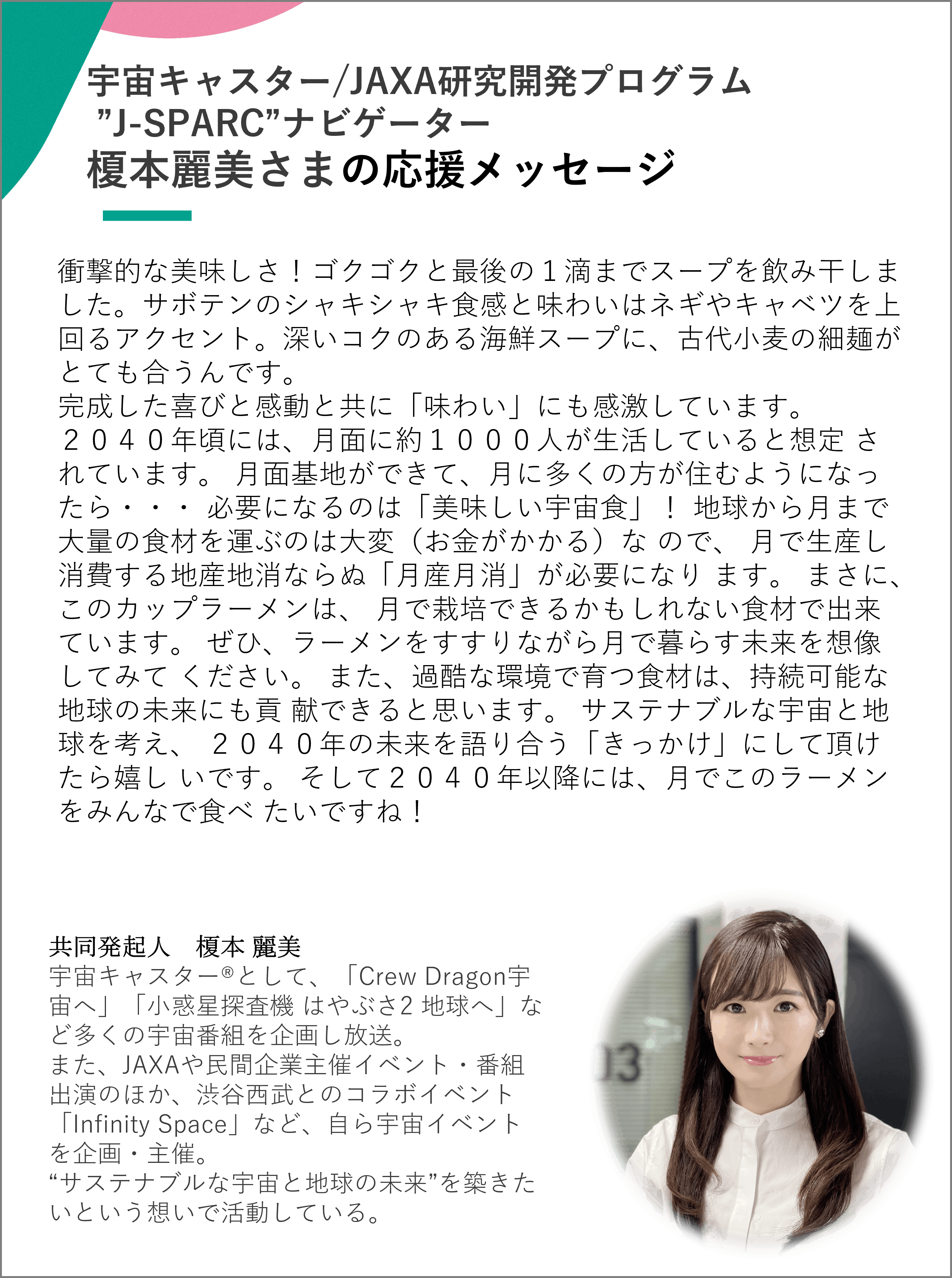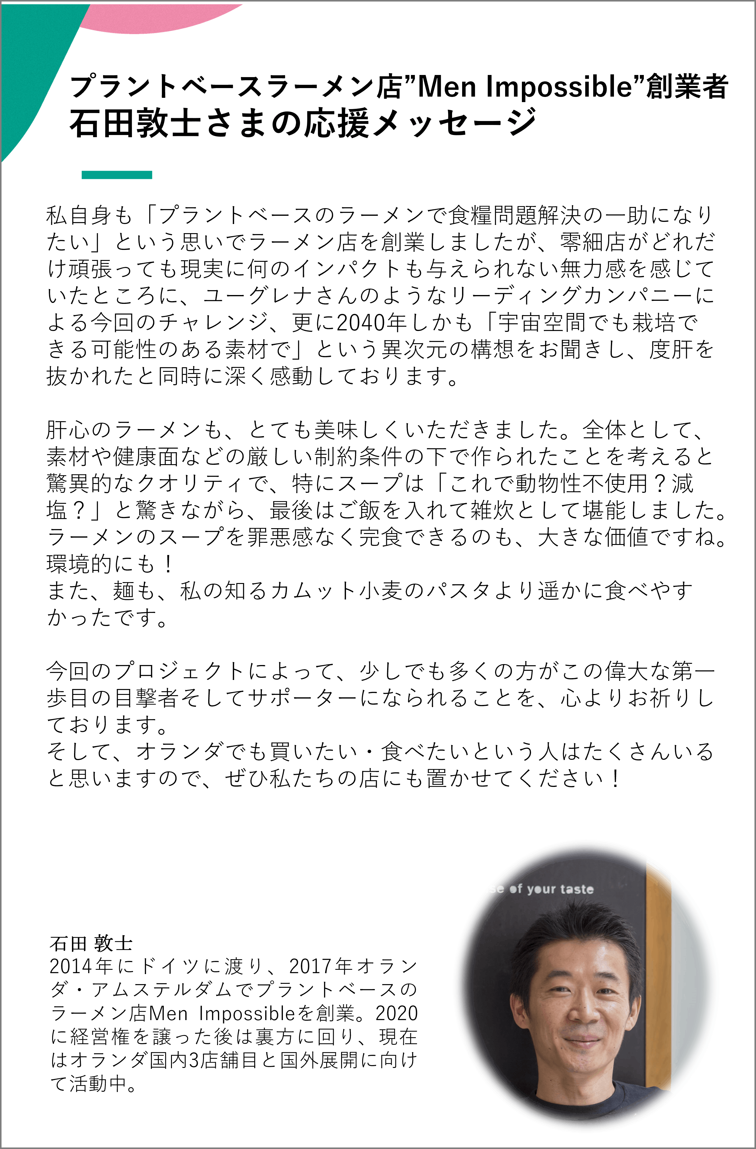 ユーグレナ社は、人と地球を健康にするために設立した会社です。2005年に世界で初めて微細藻類ユーグレナ(和名:ミドリムシ)の食用野外大量培養に成功して以来、日本のバイオテクノロジーの発展に貢献すべく、さまざまな研究開発を推進してきました。今回、地産地消の宇宙食である「宇宙食3.0」への挑戦として、宇宙のような特殊で閉鎖的な環境下でも発育・栽培できる可能性を秘めた食材を活用した即席カップ麺「2040年サステナブルラーメン」を開発しました。味や内容についてたくさんの方からご意見をいただきたいと考え、試作品を返礼品としたクラウドファンディングに挑戦いたします。どうぞよろしくお願いします!