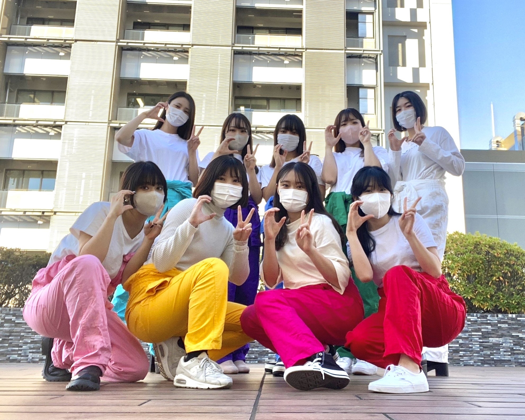 左下から はな(薄ピンク)、ねね(イエロー)、ありさ(濃いピンク)、ヒョリ(レッド)、空の(ライトブルー)、ゆりか(パープル)、ななみ(ブルー)、ゆりこ(グリーン)、ももか(ホワイト)、写真には写っていませんがあいこ(オレンジ)の計10人で活動をしています。