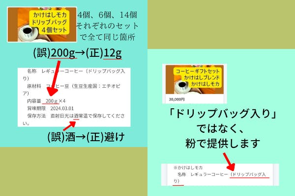 ・コーヒーのリターンで、保存方法(誤)「直射日光を酒」→(正)「直射日光を避け」