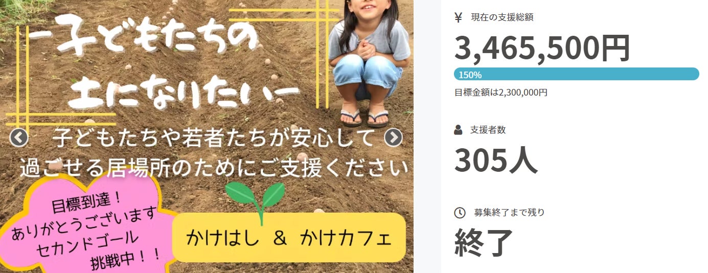 1月31日日23:59でご支援の募集を終了し、305人もの方々から、当初の目標の2,300,00円から大きく上回る3,465,500円のをご支援をいただきました。
