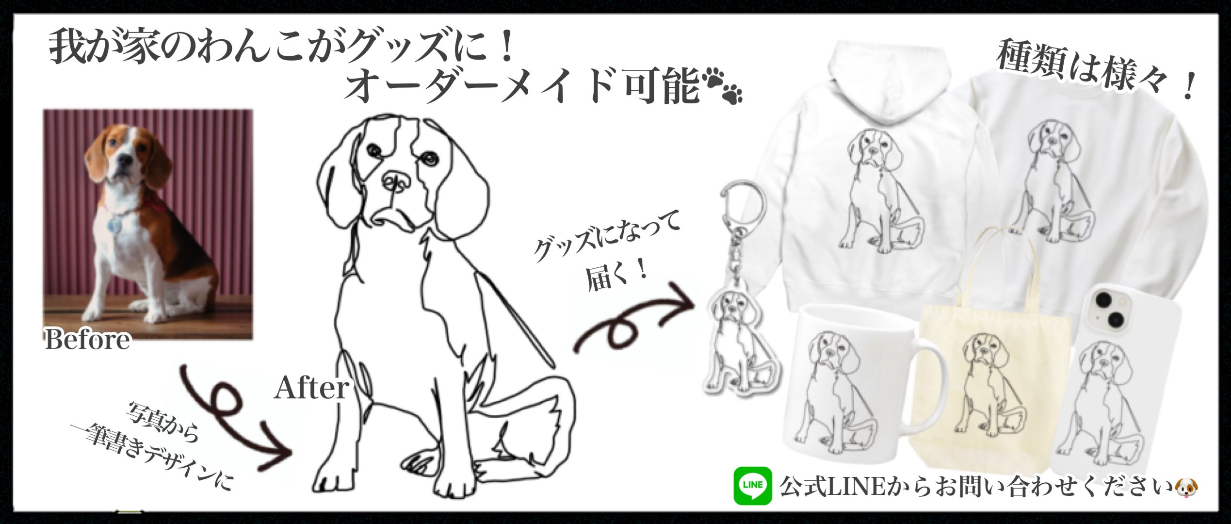 2022年7月に美容師の夫とパティシエの妻で一緒に何かできないかと思い、 2人ともが好きな犬をテーマに、うちの子グッズの販売を始めました。 オンライン限定でオーダー製の愛犬のアイテムを販売しております。