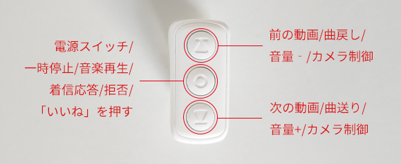 スマートフォン/タブレットを触ること無く音楽の「再生」「一時停止」「曲送り」「曲戻し」「音量調節」の操作が可能です。