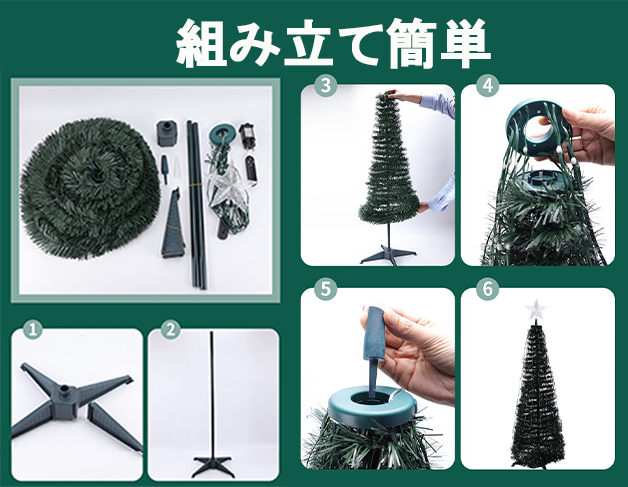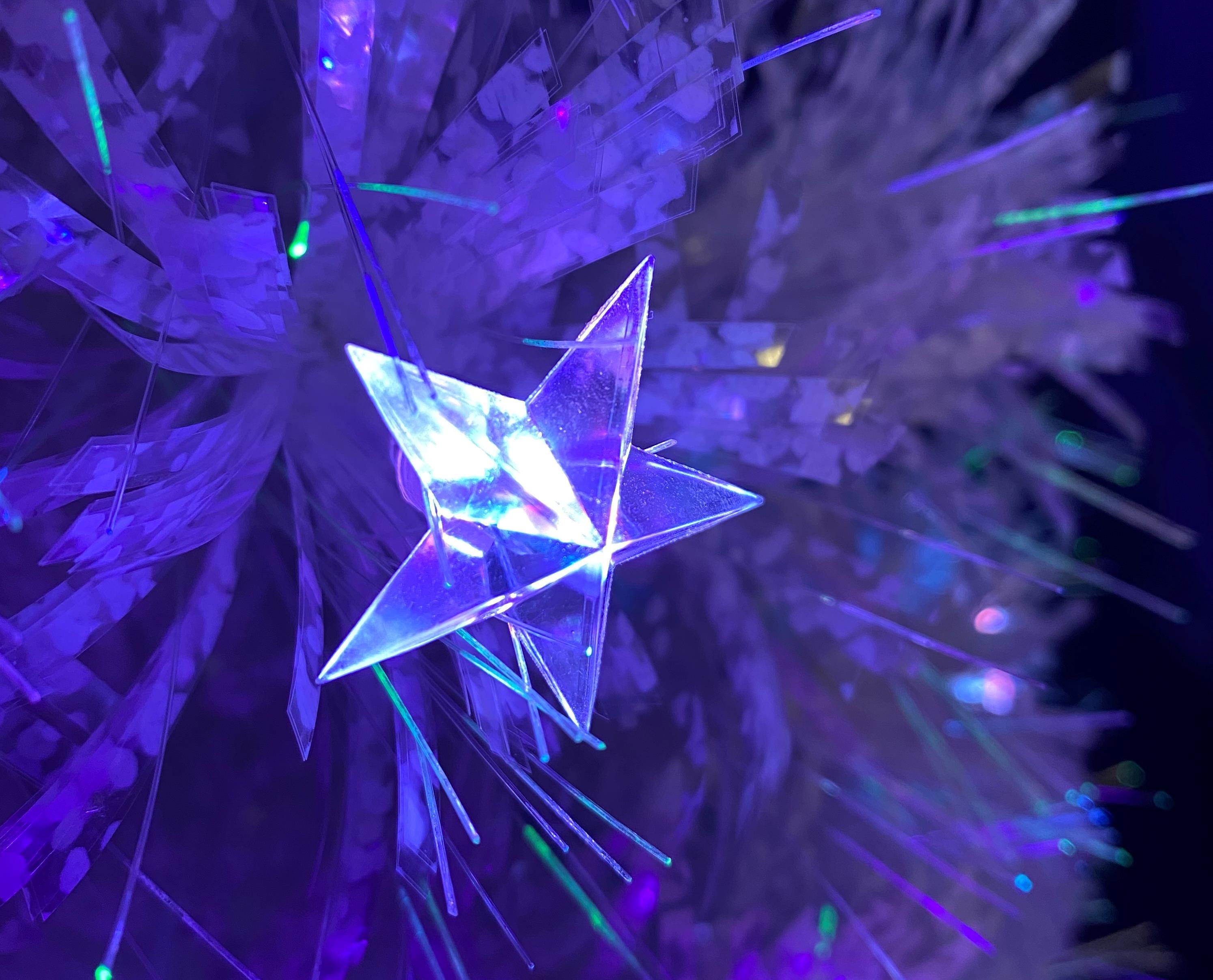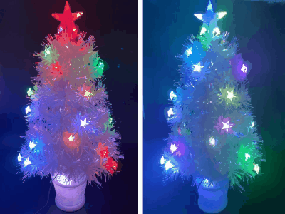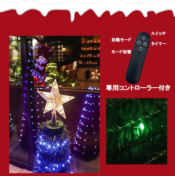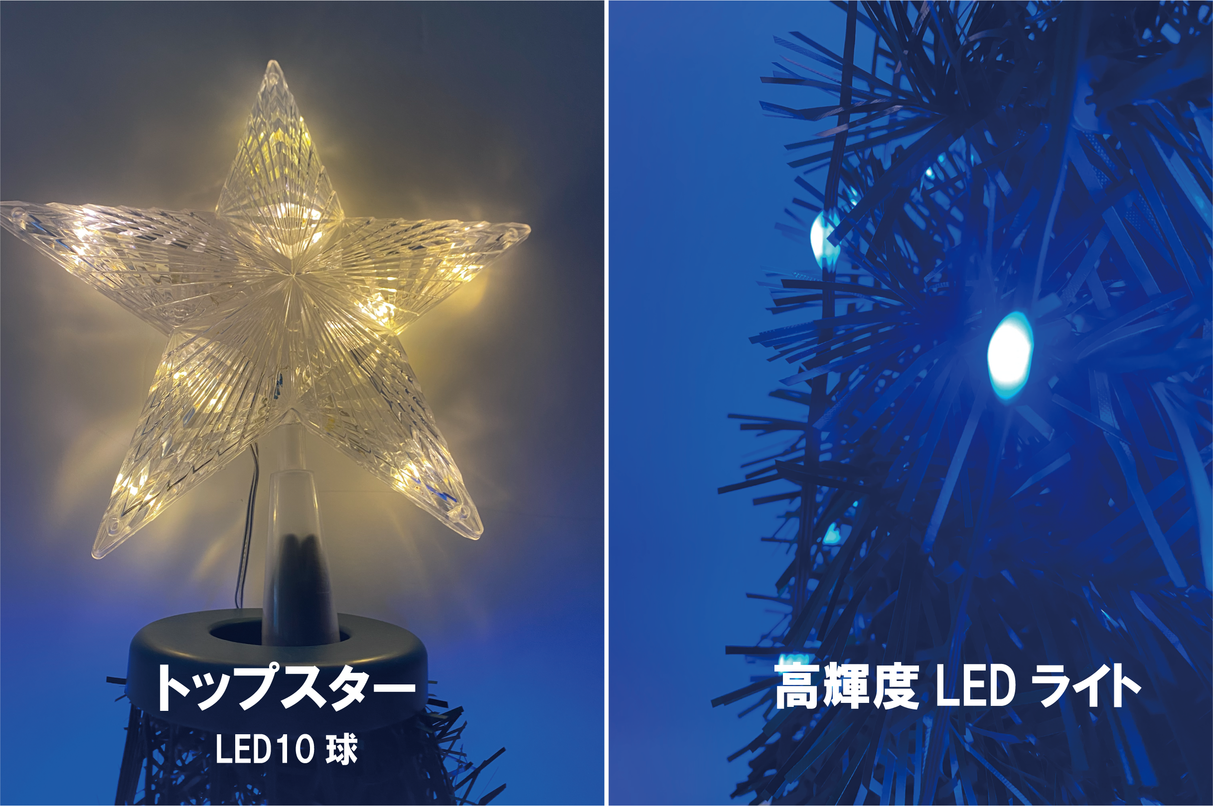 このファイバーツリーは光の表情が7色に変化する幻想的なツリーで、ファイバーのキラメキに加え、枝先のスターオーナメントが、ワンポイントとしてアクセントを付けています。