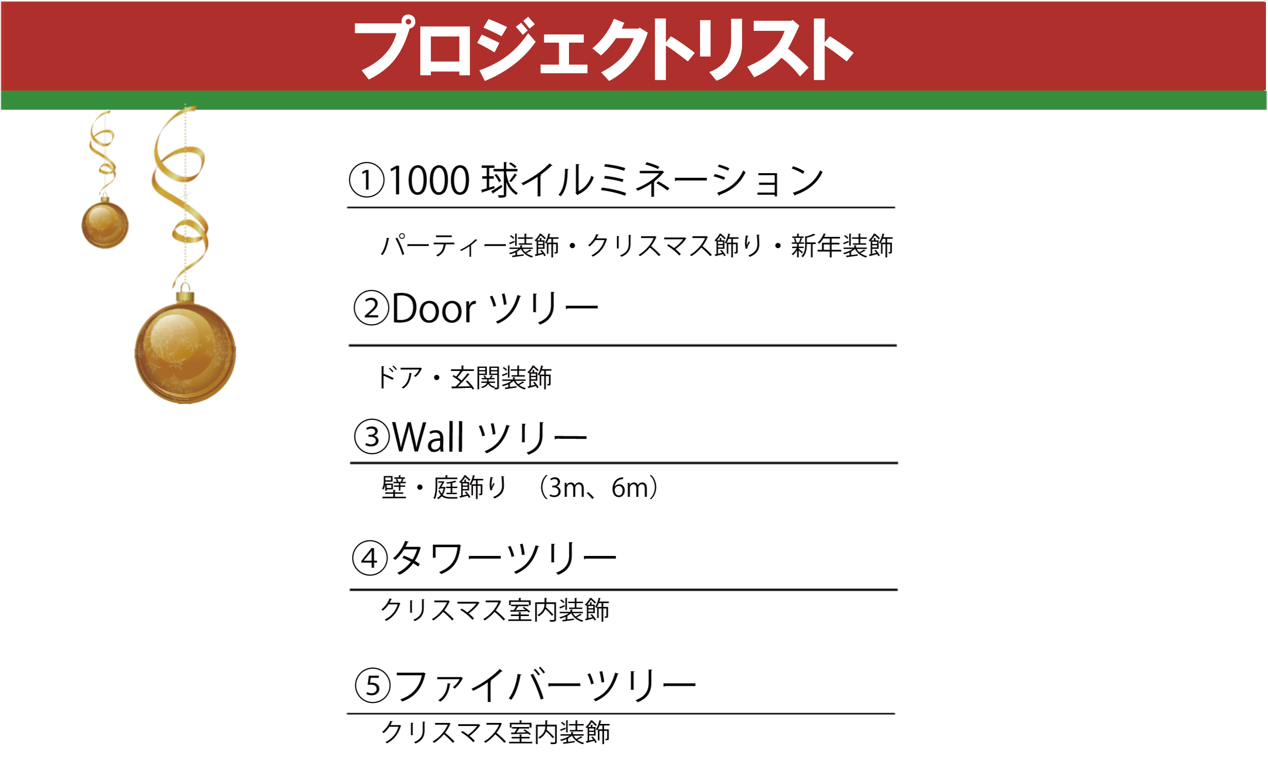 弊社はLEDを使用したクリスマス商品の開発・企画の草分け的なメーカーで蓄積されたノウハウで安全で本質の高い商品をお客様に提供いたします。