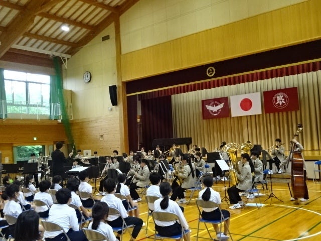 2020年、2021年は、新型コロナウイルスの影響により、コンクールや定期演奏会は何とか開催されたものの、各学校様や団体様からの依頼演奏、地域のイベントが全て中止…。この2年間、私たち吹奏楽部は様々な場面で演奏をさせていただく機会が激減し、部員自身も自分たちの音楽を聴いていただくことができずに苦しんでいるところでした。4月、恵那市立武並小学校様から依頼演奏のお話をいただきました。武並小さんは、毎年ファミリーコンサートで地元の高校生の吹奏楽部の演奏を鑑賞されているようです。素晴らしい企画です。小学生の皆さんに吹奏楽を通して音楽の楽しさを知ってもらいたい!と思い演奏させていただきました。【演奏曲】・羽ばたきの時・魔女の宅急便コレクション・鬼滅の刃メドレー・ツバメ・ぼよよん行進曲・Get it on・風になりたい前半は、4~6年生。最初は緊張している様子でしたが、体を揺らしながら楽しそうな表情で聴いてくれました。知っている曲が多いと自然に体が揺れたり、口ずさんだりしてくれる児童さんが多く見られました。後半は、1~3年生。低学年の児童の皆さんは、「あ、この曲知ってる!」と言いながら、歌に乗せて一緒に口ずさんだり、音楽の授業で、3拍子を習ったばかりで魔女の宅急便は、指揮者と一緒に指揮をしてみたり…素直で無邪気な姿に部員も自然と笑顔になれました。最後は、お礼の言葉と花束贈呈。素直で一生懸命に私たちの音楽を聴いてくださり、部員一同、心より嬉しく思います。後日、保護者によるメッセージアルバムもご丁寧にいただきました。「高校生の演奏はすごいと思いました」「迫力のある曲ばかりでまた聴きたいです」などの心温まるメッセージも本当に多くいただきました。音楽は人と人との輪を繋げる、素晴らしい力があることを改めて実感しています。感謝の気持ちでいっぱいです。ありがとうございました。