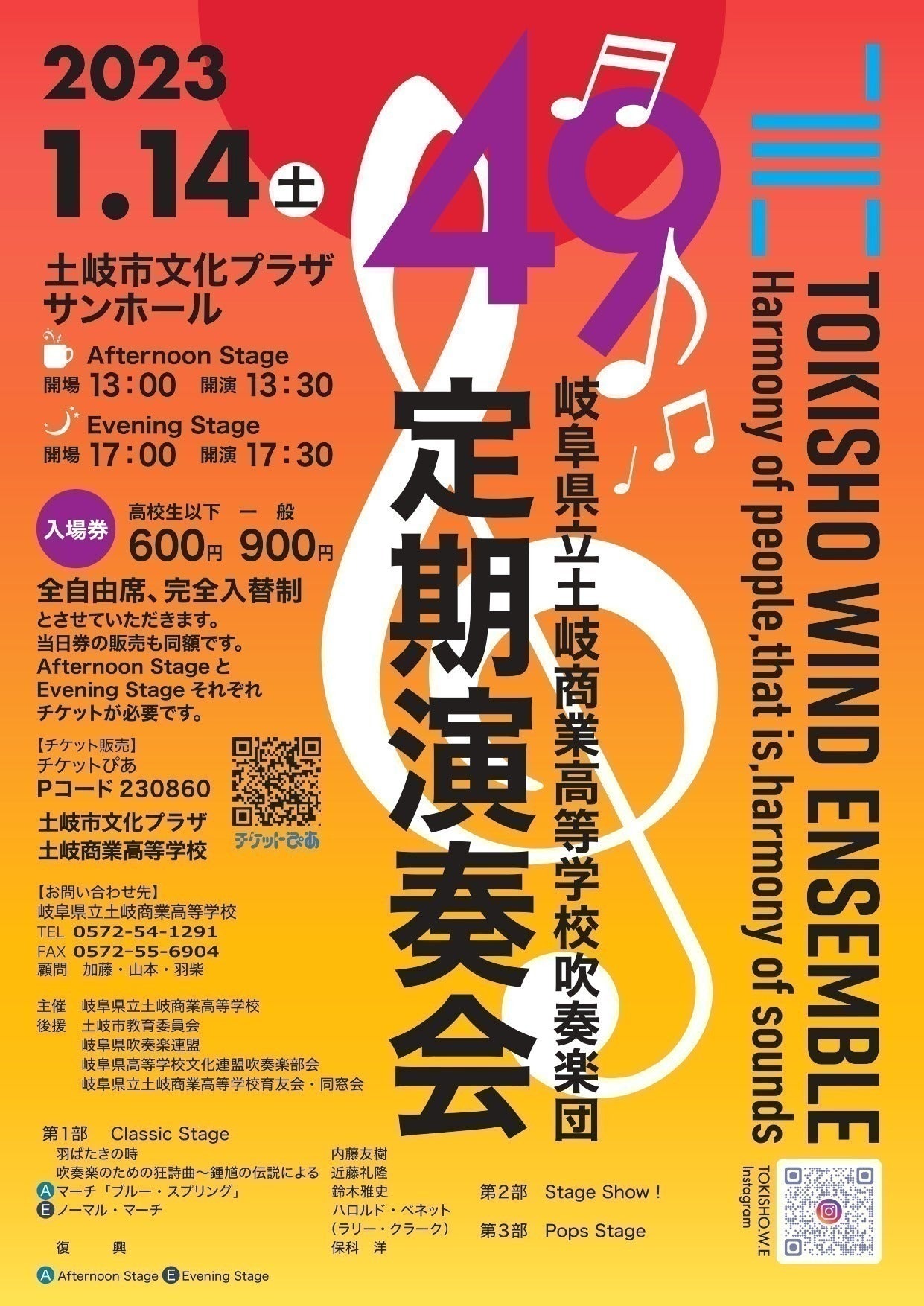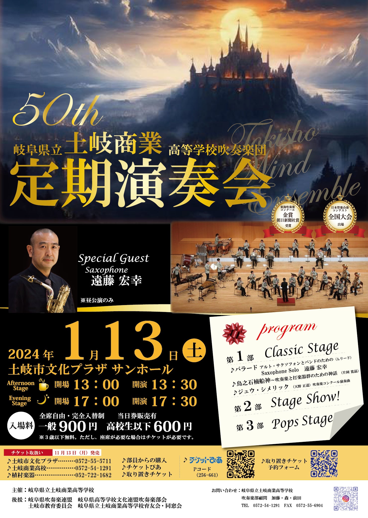 2023/11/23 14:43お知らせです!岐阜県立土岐商業高等学校吹奏楽団 第50回定期演奏会を今年度も開催します!2024年1月13日(土)土岐市文化プラザAfternoon Stage 13:00開場 13:30開演(ゲスト演奏有)Evening Stage 17:00開場 17:30開演一般900円 高校生以下600円(3歳以下無料)チケットは、土岐市文化プラザ土岐商業高校チケットぴあ部員からの手売り植村楽器取り置き予約フォームでお買い求めできます。是非、お誘い合わせの上、ご来場ください。部員一同、お待ちしております♪また、近々クラウドファンディングも行います。50万円を目標金額としています。今年は、記念すべき50回の演奏会です。日頃お世話になっている、遠藤宏幸先生(名古屋芸術大学准教授)によるゲスト出演もあります。よろしくお願いいたします! もっと見る【報告】リターン発送完了