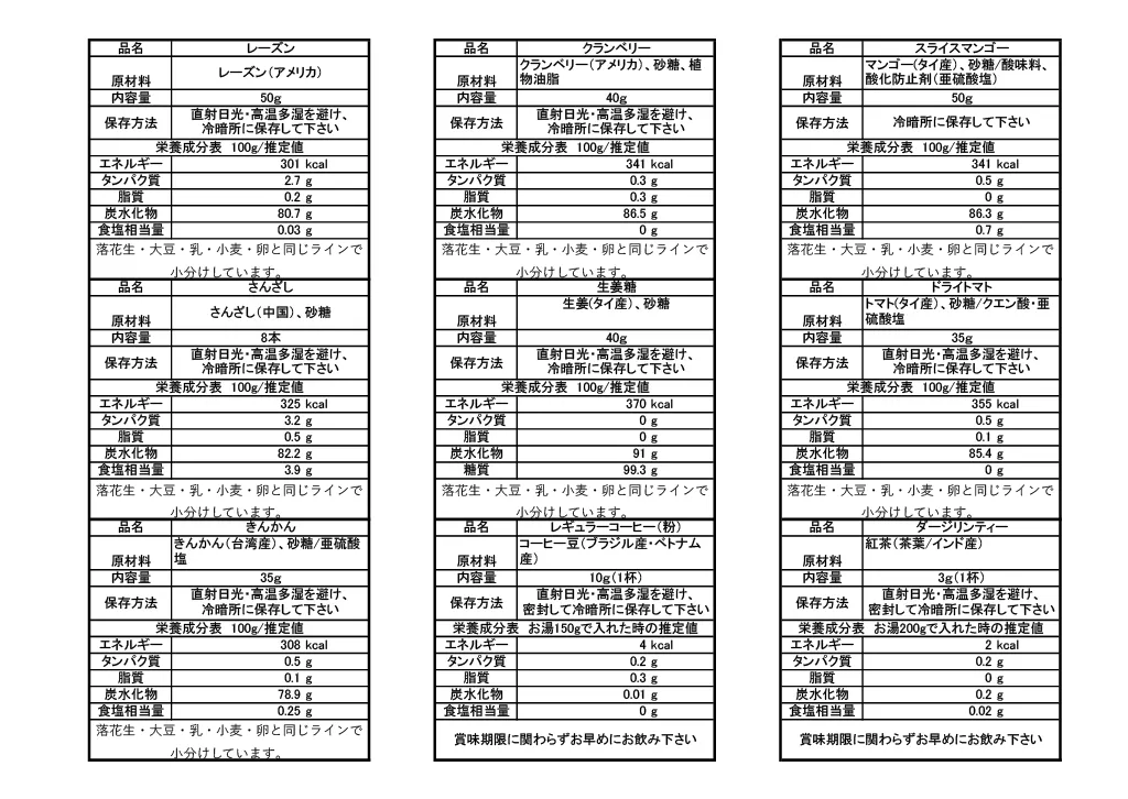 リターンに使う食品一覧(内容物・内容量・栄養成分表示は下記を参考下さい。