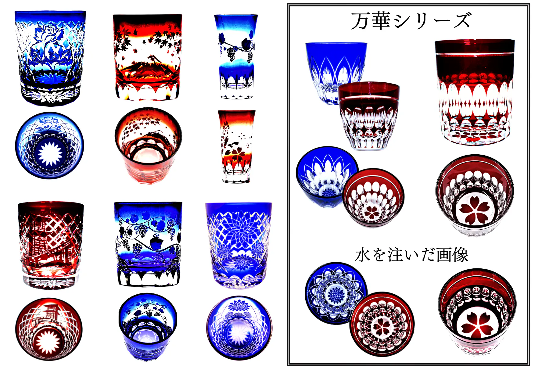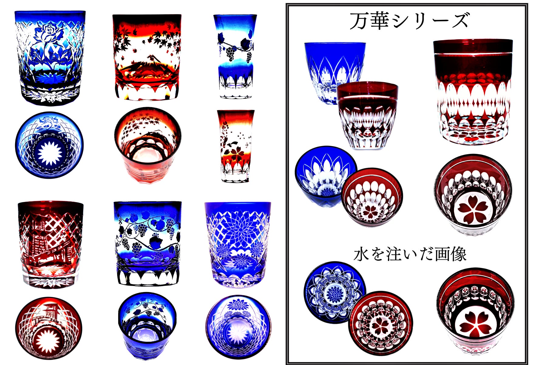 万華(ばんか)シリーズは、お酒(水など)を注ぐことで、底部の花模様が側面の切子(カット)部に写り込み、まるで万華鏡のようにグラス一面に花が咲き誇ります。お家(うち)飲みが、ちょっと楽しくなりませんか?ご友人との会食にも、贈答品や記念品にも最適です。