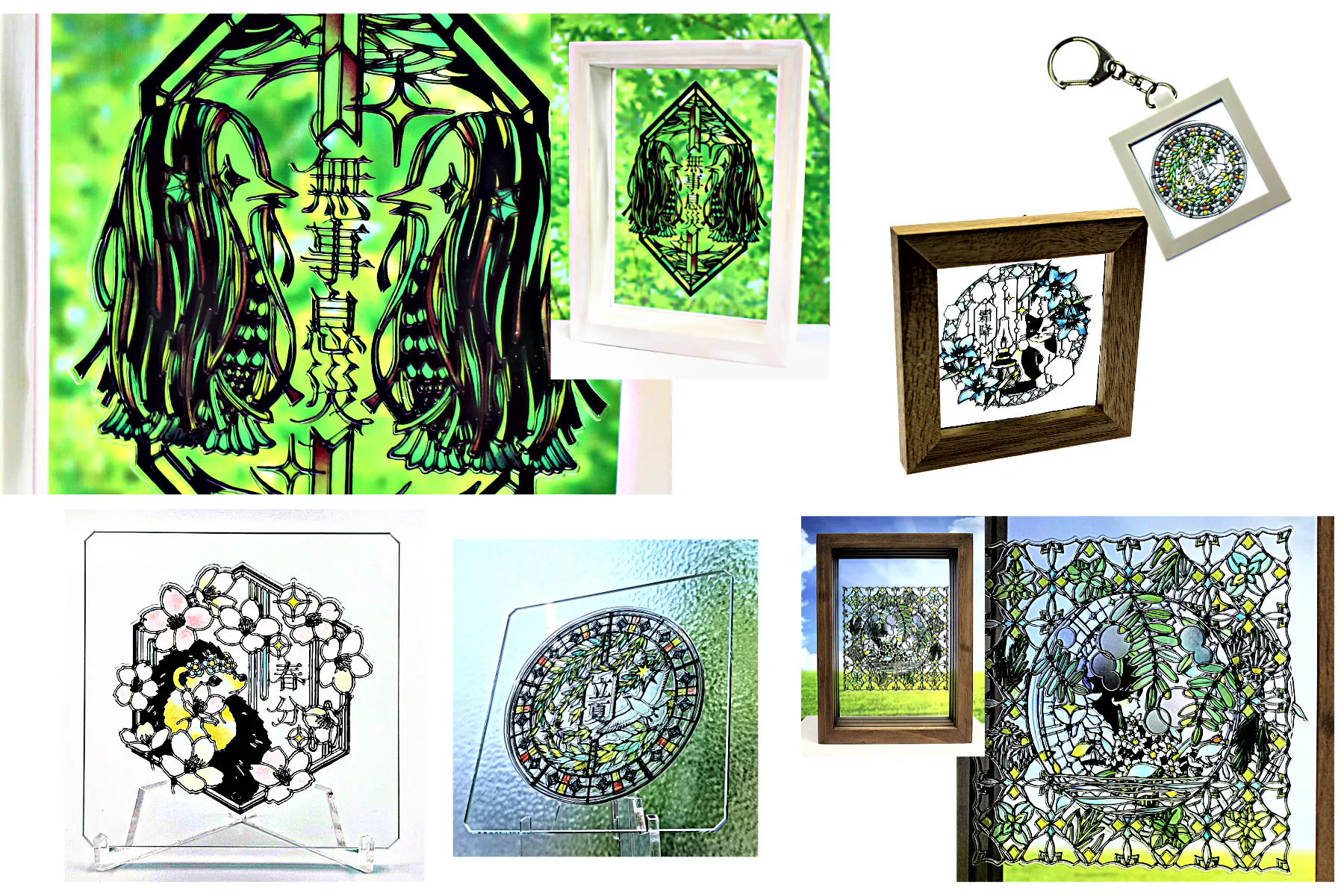 先生の切り絵は、黒い画用紙と手染めの和紙を用いたステンドグラスのような他にはない趣のある画風が特徴です。ケミカルエッチングによる掘り込みと、裏からの印刷により、ガラスに忠実に再現しました。ただ印刷するだけでは得られない、立体感のあるステンドグラスのような製品に仕上がっています。電子関連で培った技術がなければできない精巧且つ美しい製品です。額装や観賞用にもなるコースターやキーホルダー、マグネットとして販売しています。