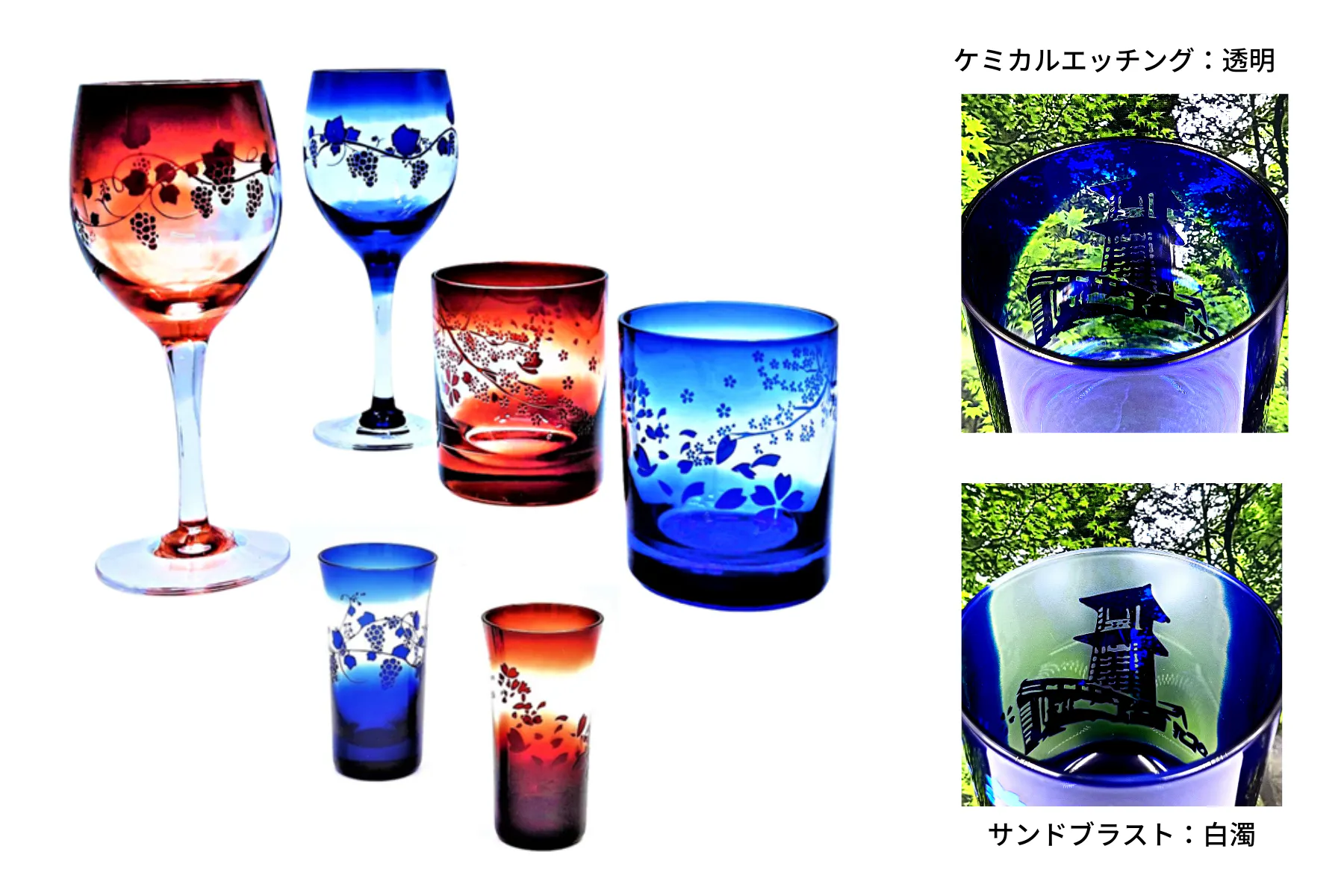 *サンドブラスト(研磨剤で強く叩く)法でも、①と同様の色絵柄が可能ですがブラスト(エッチング)した部分が白濁します。