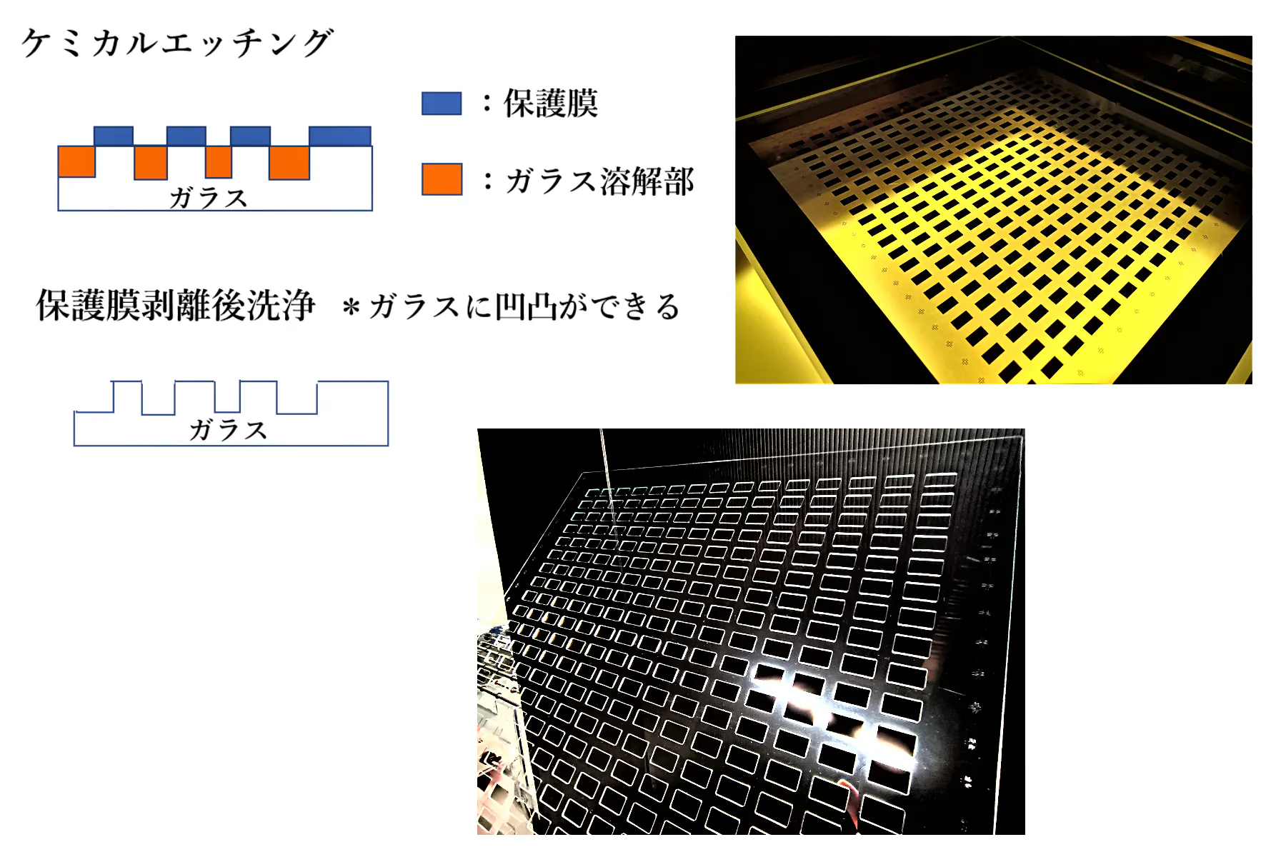 酸(自社調合)を用い、ガラスを化学溶解する製法です。エッチングする部分としない部分を作り、ガラスに凹凸をつけることでデザインを形成します。エッチングしない部分を保護膜でカバーして、エッチングを行います。