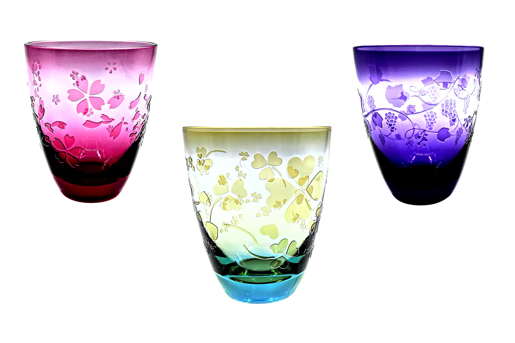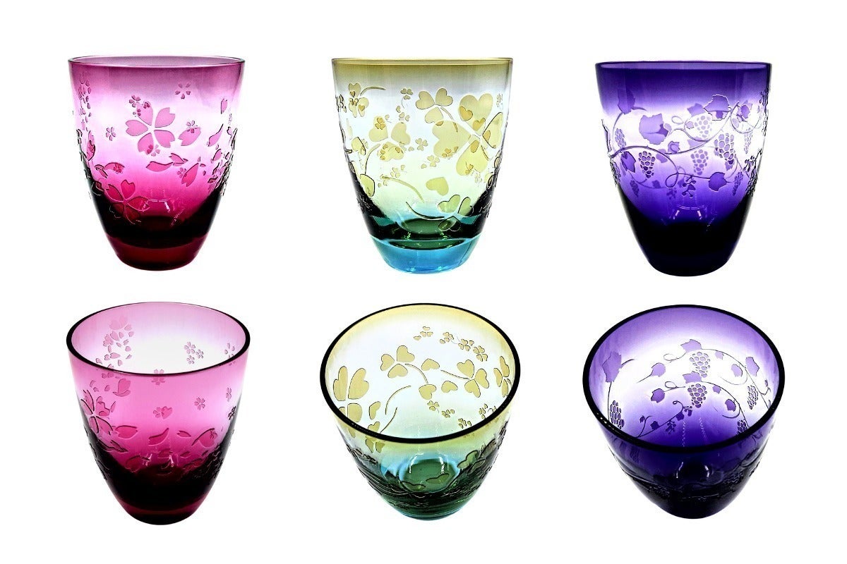 Tintシリーズ:淡い色とそのグラデーションがガラスの透明感とマッチしたとてもオシャレなタンブラーです。葡萄・クローバー・桜のデザインも可愛らしいですね。