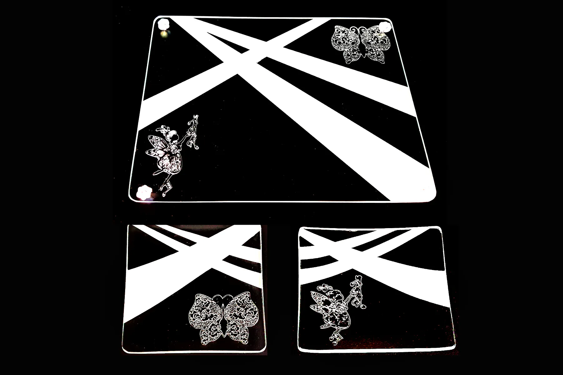 先生のレース切り絵と称される細やかで繊細な切り絵をガラスに再現することには、非常に苦労しましたが、高度なケミカルエッチング技術だからこそできる製品になっています。今回は、先生の「天使」と「蝶」の切り絵を小皿と中皿(プレート)にして販売いたします。切り絵とガラスの透明感を表現するため、印刷などは使用せず、あえてシンプルに仕上げました。ティータイムや食卓をオシャレに彩ります。エッチング加工は、裏面に施していますので、表面は、滑らかで、汚れても洗浄すれば、簡単に落ちます。敷マットをお付けしていますが、お好みのランチョンマットと合わせるのも楽しみの一つです。(但し、淡い色のマットの場合は、切り絵デザインが見えにくくなりますので、ご注意ください。)