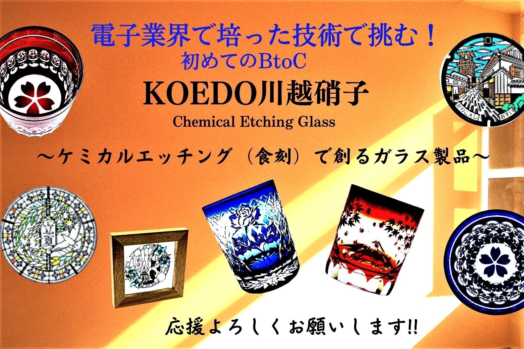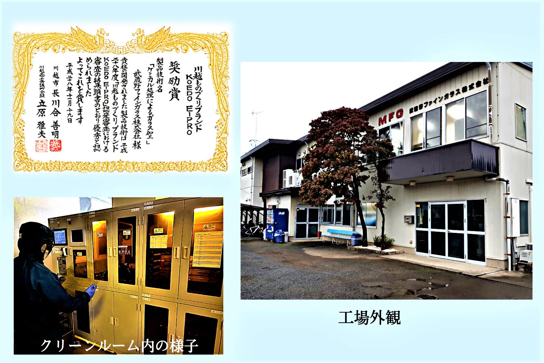 「KOEDO川越硝子」の製品を製造する工場が、武蔵野ファインガラス(株)です。長年、このケミカルエッチング加工したガラスは、LCDや有機EL、タッチパネルに採用されてきました。最近では、半導体やセンサー等にも利用されています。2018年には、その技術の独創性をご評価いただき、川越市よりものづくりブランド「KOEDO E-PRO」企業に認定いただき、奨励賞を受賞しました。
