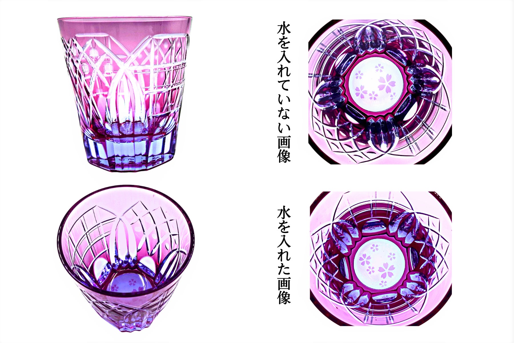 ピンクと神秘的な淡いブルーが、素敵なグラスです。柔らかいデザインの切子カットと底に薄っすらと浮かぶピンクの桜花が、グラスをさらに美しくしています。水を注ぐと側面のカット部に底の桜花が密やかに写り込んでいるのが見えます。立体的に見える桜花が何とも言えず愛らしいと感じていただけると思います。