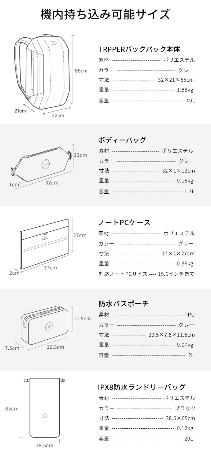 今回、セット購入として4つのこだわりパッキングツールを用意しました。あらゆるシーンでのTRIPPERの使用を想定した、高品質かつ多機能設計で、持っておけば間違いなしです!本体との統一感のあるデザインで、おしゃれかつミニマムに理想の旅を叶えます。