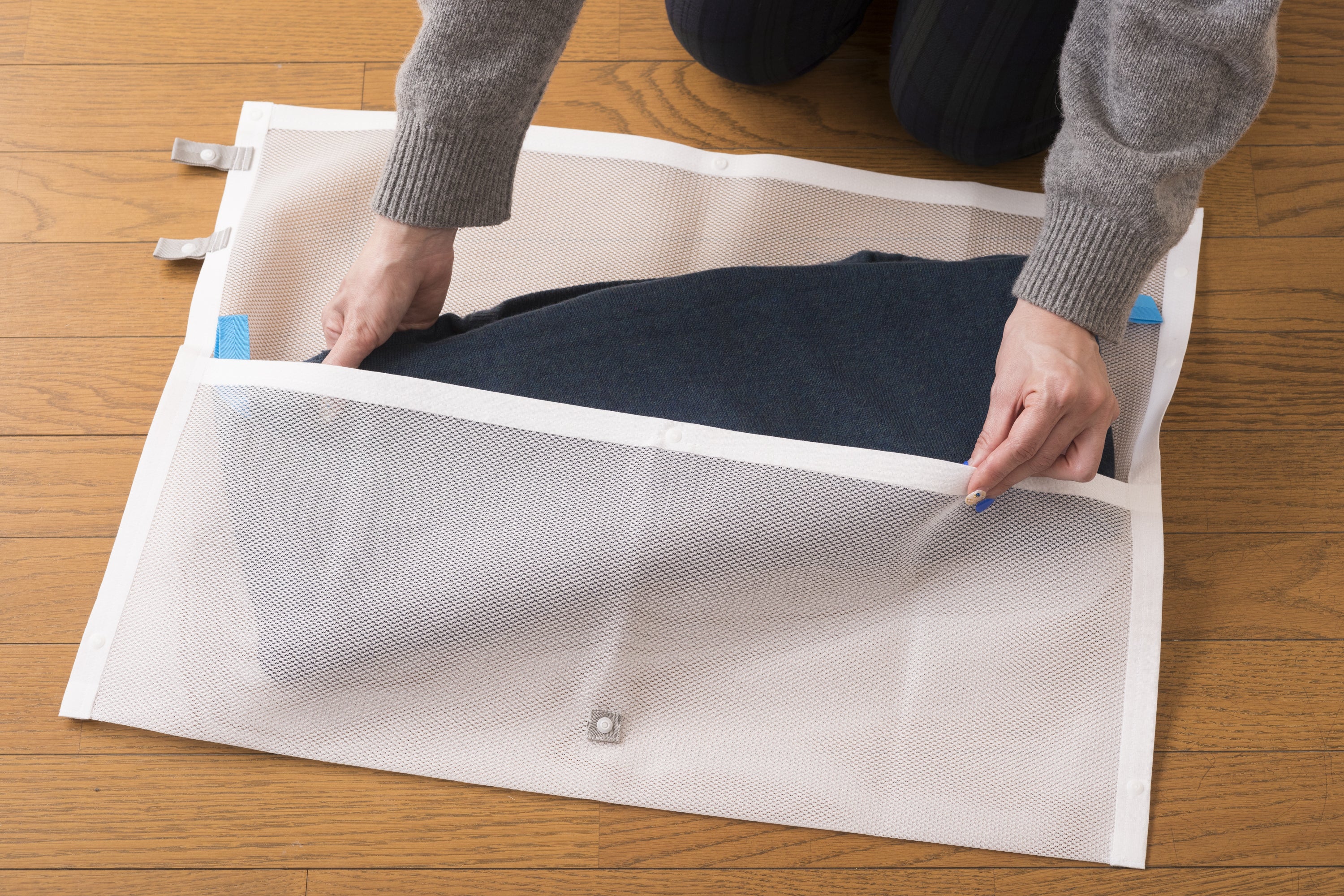 インナーネットを装着したお洋服をたたんで入れます。スナップをすべて止めれば、お洗濯中もお洋服の形状が崩れません。