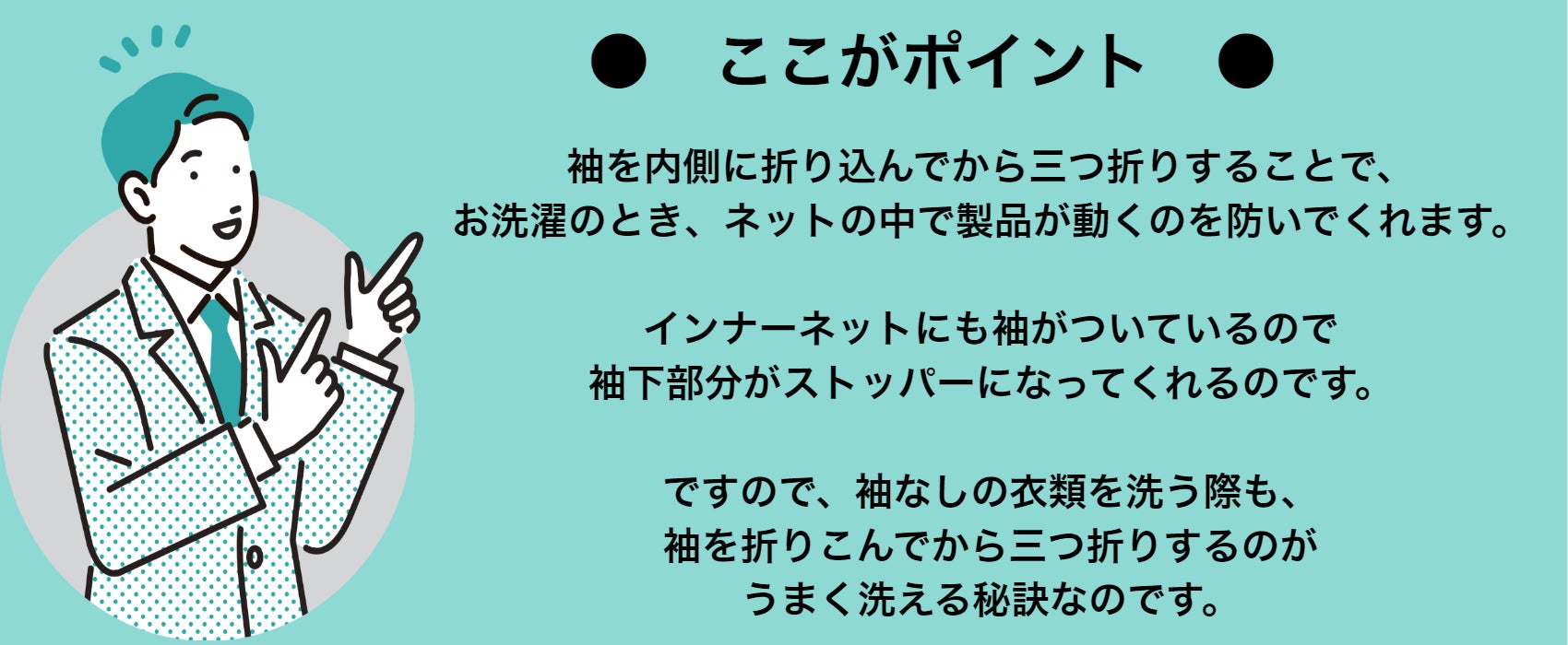 袖を折り込んでから三つ折りすることで、ネットの中で製品が動いてしまうのを防ぎます。