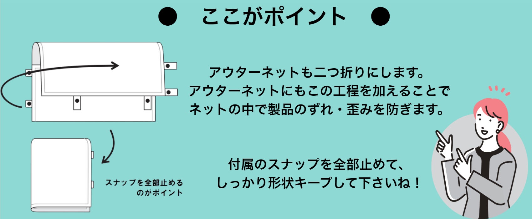 最後、2つ折りにしてスナップを止めるのがポイント。
