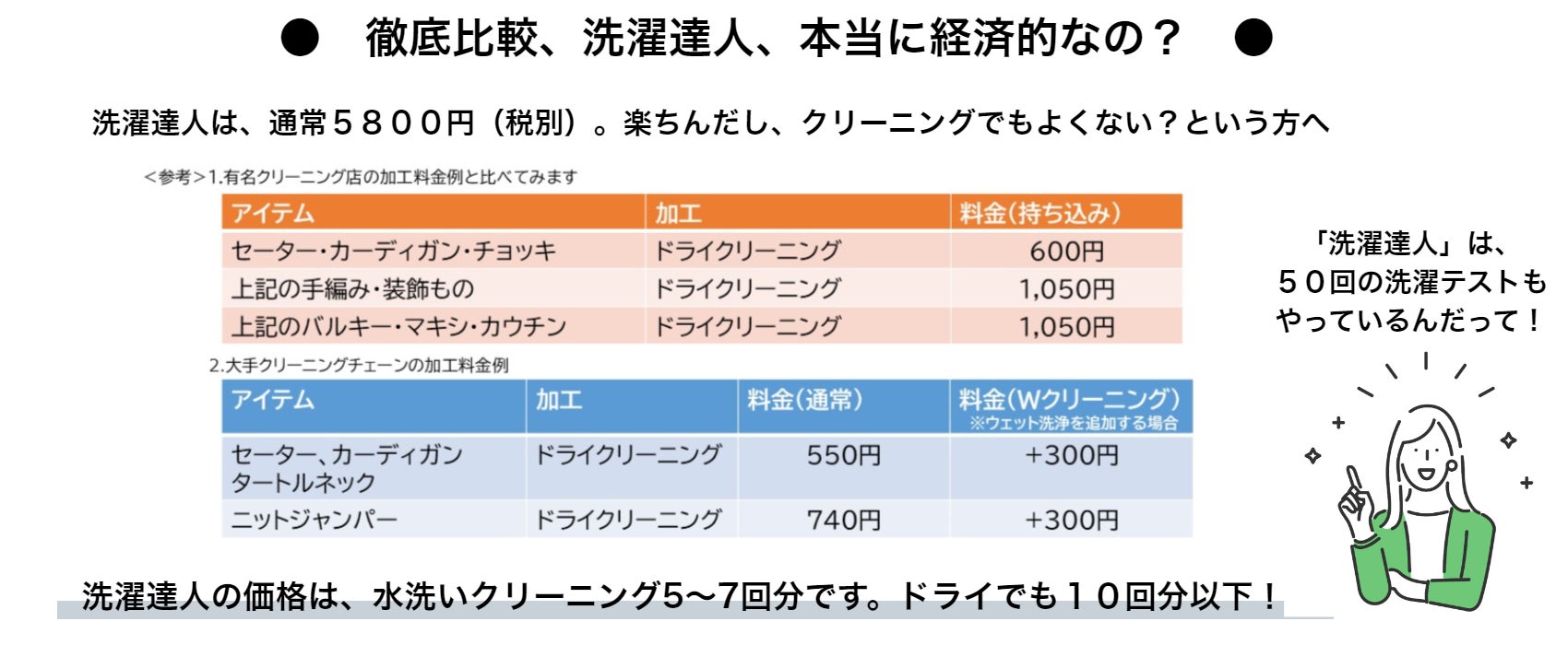 クリーニング店の水洗いクリーニングより、お得にお家で洗濯できます。