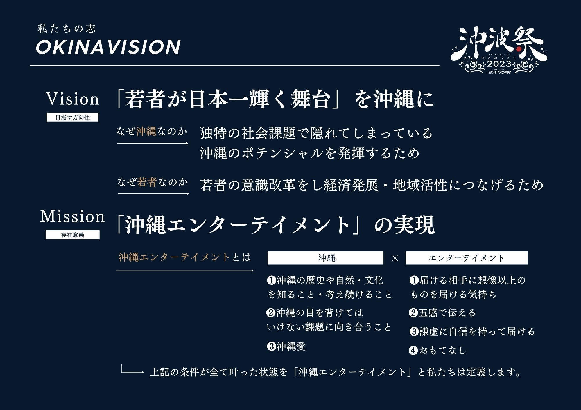書いてある通り、私たちが描くミッション・ビジョンは夢のように大きなものです。この志を持つ次世代の若者を一人でも多く輩出することが沖波祭の使命であり、諦めてはいけない壁です。だからこそ私たちは、初開催からは大胆に、そして覚悟を持って挑戦をすることを決めました。