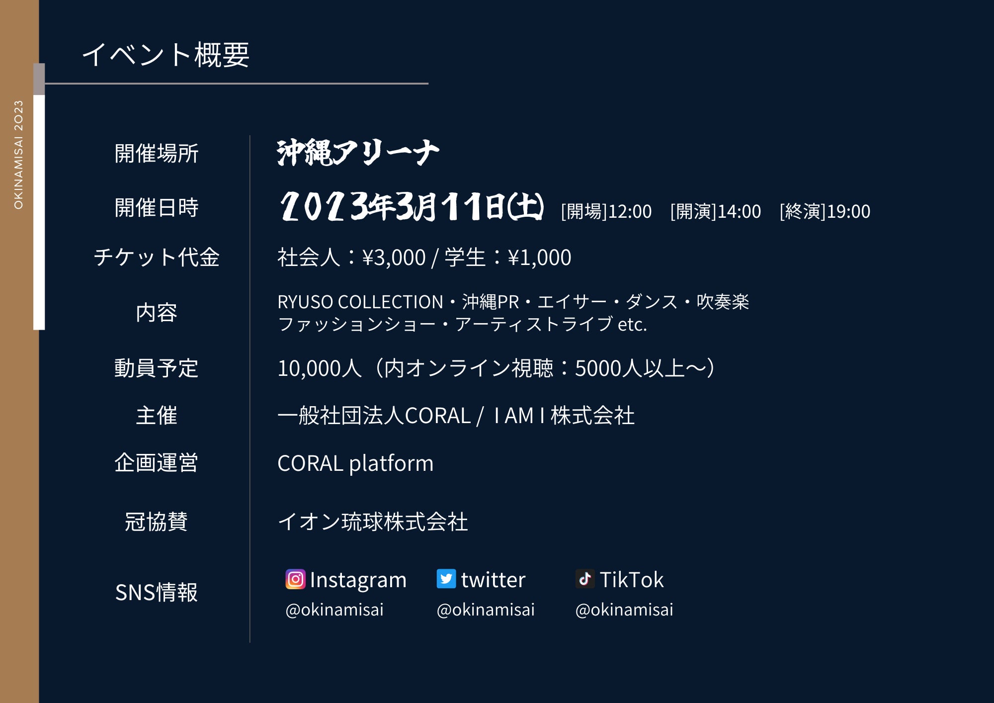 イベントではオフラインで高校生・大学生をメインに5,000人のお客様をお迎えし、「沖縄の魅力をエンタメのチカラ」で最大限に発信します。約六時間のお祭りは20ステージに及ぶステージショーや1日限りの沖波祭縁日など、誰もがワクワクし、無意識に沖縄を愛してしまうような空間創りに拘ります。