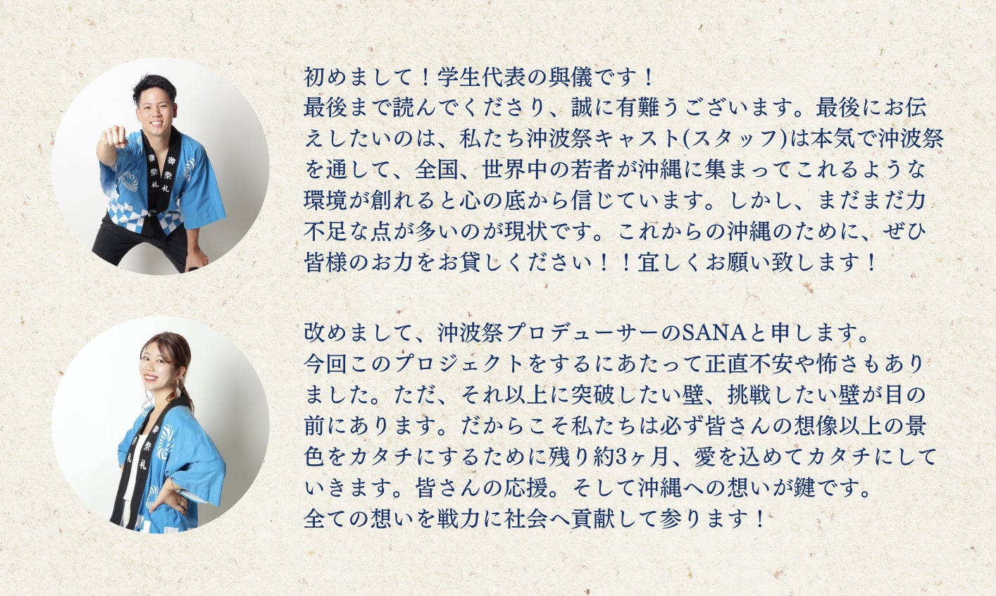 ここまで読んでくださり有難うございます。私たちは日々沖縄について深く考え、時には仲間同士でぶつかり、その中でも楽しむことだけは忘れずにここまできました。ここからが本当の勝負だからこそ、皆さんの応援・シェア・口コミが私たちの支えになります。 沖縄から日本へ新たなソーシャルインパクトを生み出し、「応援をしてよかった」と思ってもらえるお祭りを必ず実現してみせます。