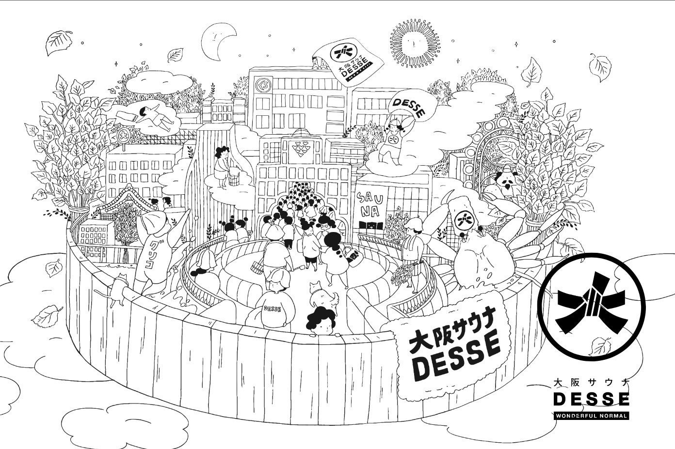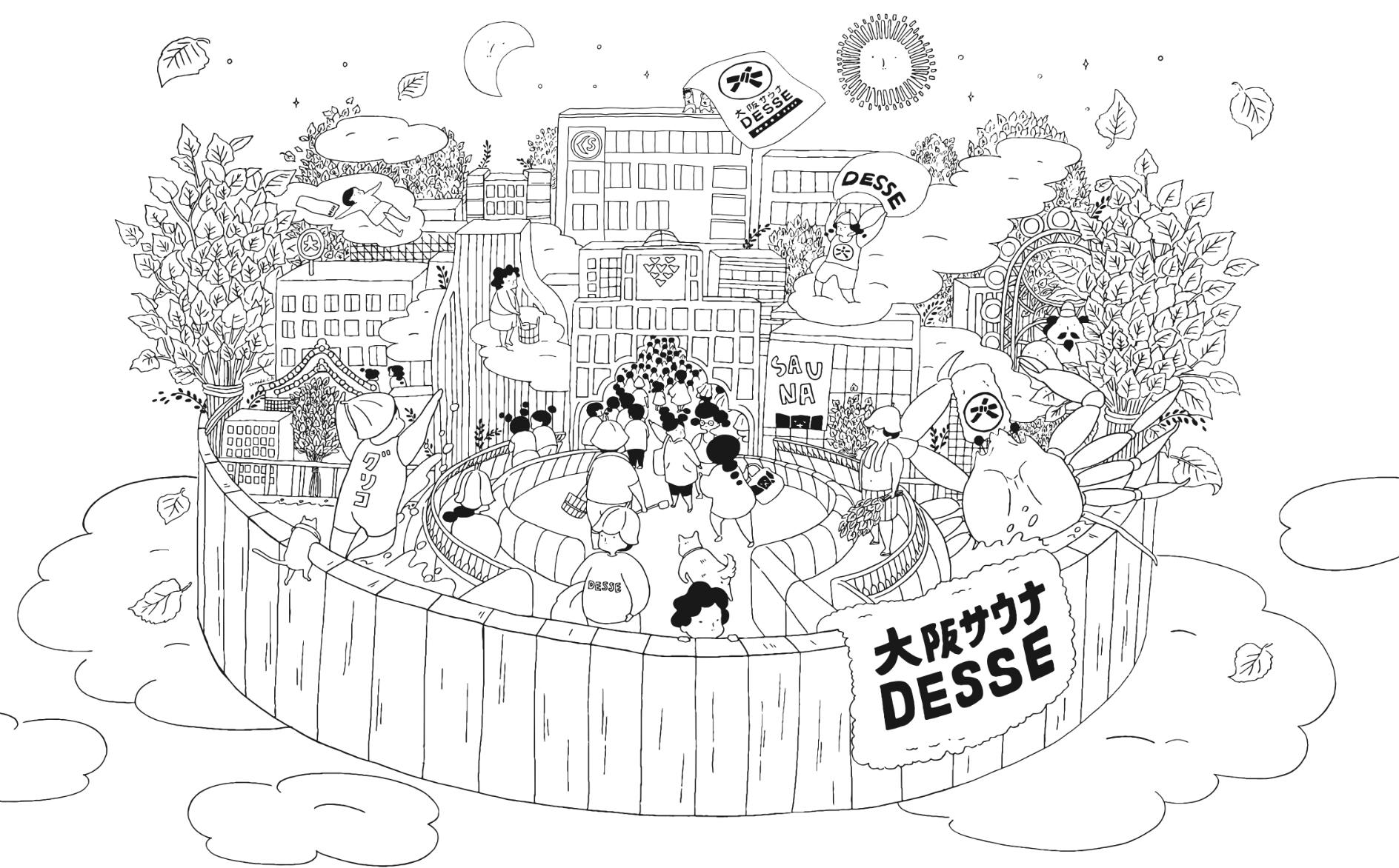 大阪サウナDESSEオリジナルの柄をイラストレーターの伊達努氏に描き下ろしていただきました。運営スタッフの制服もチルさんで制作中です。