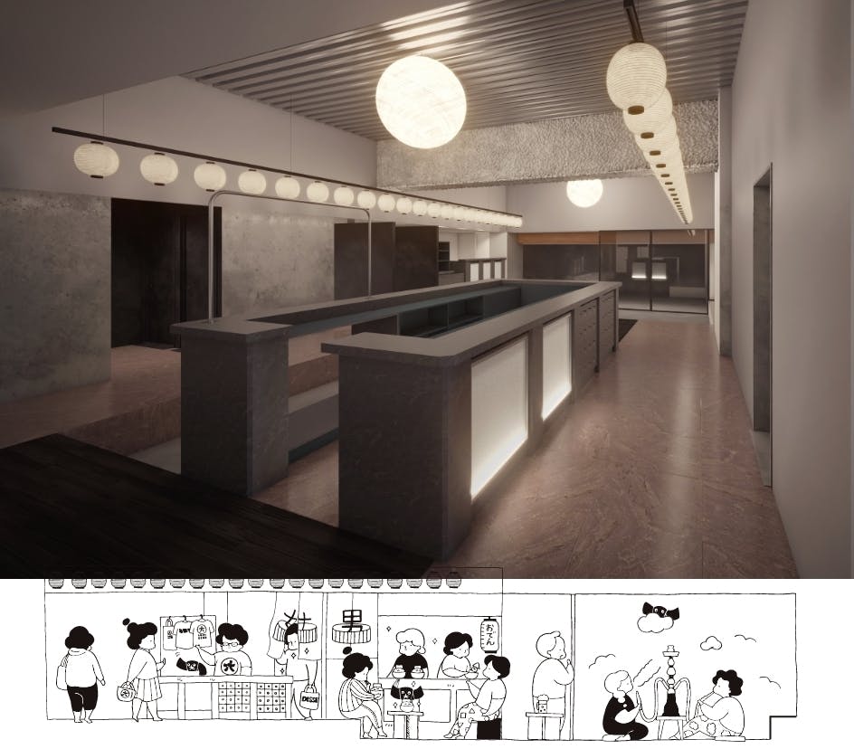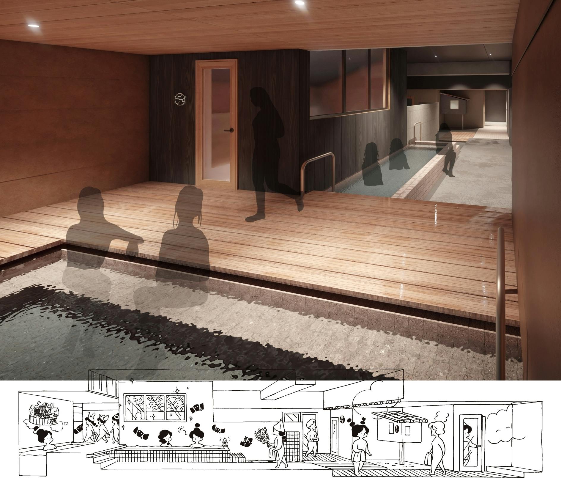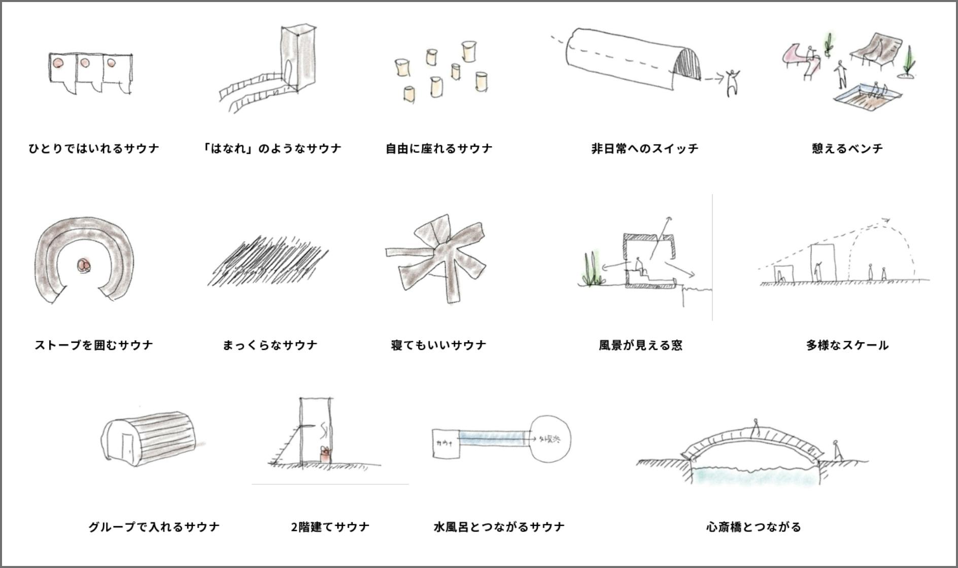 プロジェクト初期に妄想の中の一部を建築士である株式会社OSTR代表の太田翔(おおたしょう)氏に、スケッチで描いていただいたものになりますが、この無茶振りのような妄想が、ほぼほぼ実現されるサウナができようとしています。
