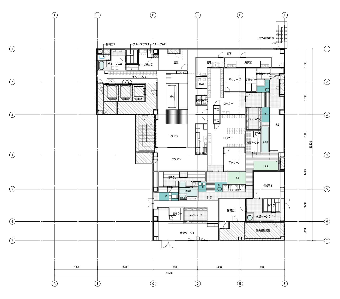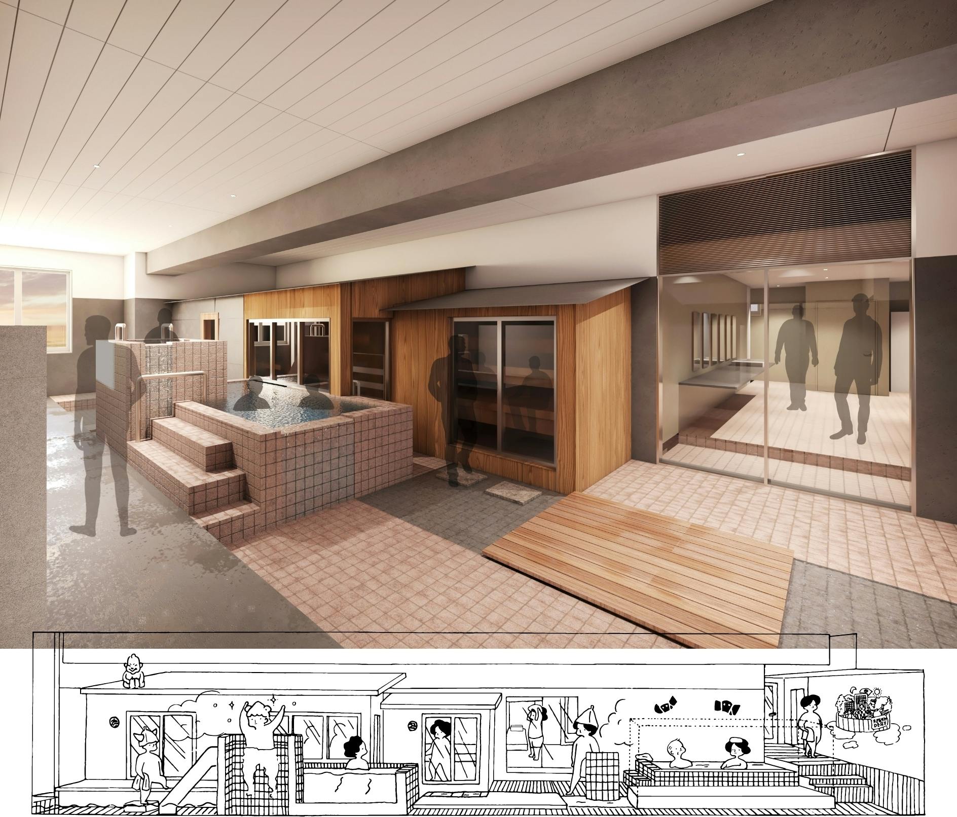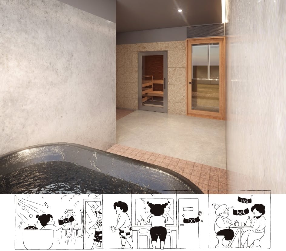 大阪サウナDESSEは、2エリアにまたがる7つのサウナに加え、貸切サウナが1つという構成で予定しています。
