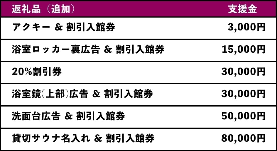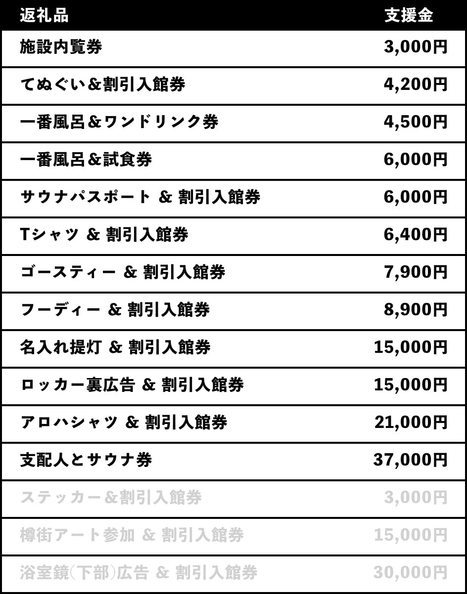 2023/04/14 17:48ご支援いただいた皆さま、リターンのご対応が遅くなっており、大変申し訳ございません。はじめてのことで、ご満足いただけるよう日々動き回っておりますが、追いつかず、ご迷惑をおかけしてしまっております。お客様からのお問合せやSNSでいただいております、男女デー、レディースデー、メンズデー、についてですが、混乱をさせてしまってこちらも、大変申し訳ございません。当初より、男女デーが週2回、レディースデイが月2回という周期で考えておりましたが、明記できておらず、思い違いをさせてしまいました。男女の施設充実といいますのも、レディースデーのときには、アメニティやフードなどを通常営業時とは異なった特別感のあるものに変更をするということやスパメニューの充実ということを考えておりました。法規上、プレオープン時のような水着を着て全てのサウナをご利用いただくということができず、男女デーもエリアを区切った状態でのご利用となります。色々とご説明が足りず、ご迷惑ばかりおかけしてしまって、本当に申し訳ございません。また、手ぬぐい、サウナパスポート、ステッカー、ゴースティー、アロハシャツ のリターン品ですが、ご用意は出来ているものの、ご連絡できておらずでした。ご来場いただいた際に、お声がけいただきお待ちいただいたお客様もいらっしゃいましたが、今後、お声がけいただいた方には、その場でお渡しさせていただきます。すぐにお渡しすることの出来なかった方々には、大変申し訳ございませんでしたが、今後のご対応は、このように変更させていただきますこと、ご容赦ください。その際は、入館券のリターンも同時にご対応させていただきます。最後に、女性入浴に関して、ご迷惑と思い違いをさせてしまい不快な思いをさせてしまったこと、ご期待をしていただきましたのにお応えできなかったことから、ご支援いただきました中でご希望の方へは、ご返金のご対応をさせていただければと思います。その際、リターン品のご提供はキャンセルとさせていただきます。ご対応の方法としましては、店頭での直接のご対応、もしくは、DMにてお口座情報をご連絡の上、お振込みでのご対応とさせていただきます。【御覧いただけるリターン】・名入れ提灯 ラウンジに2列飾らせていただいております・樽街アート参加 ロッカー装飾の樽街セットに皆さまのイラストを飾らせていただいております【今後の予定】4月15日 手ぬぐい、サウナパスポート、ステッカー、 ゴースティー、アロハシャツの店頭での交換開始4月16日 鏡/ロッカー広告のご入稿テンプレート送付 貸切サウナ名入れのお名前についてご連絡 樽街アートのイラストとロッカー写真のご連絡4月20日〜 リターン品交換券はがきの発送 20%OFF割引券交換開始5月中旬 Tシャツ、フーディ交換、アクキー 貸切サウナ予約の開始及び貸切サウナへの永久名入れ 支配人とサウナ券のご利用開始(優先ご予約) もっと見る