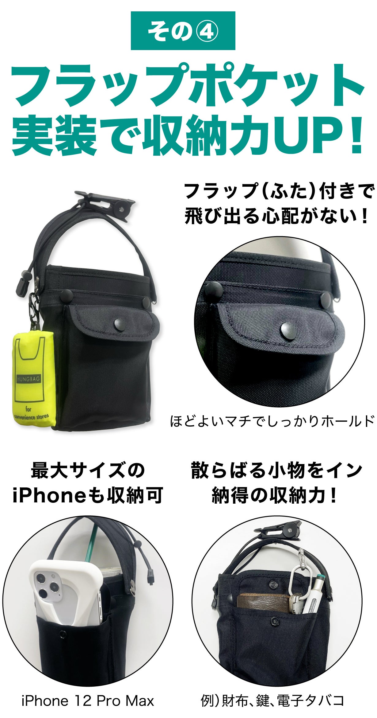 ④「フラップ(ふたつき)ポケット」実装で小さいのに抜群の収納力!