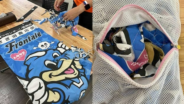 川崎フロンターレ様からご提供いただいた応援フラッグを洗濯後に裁断