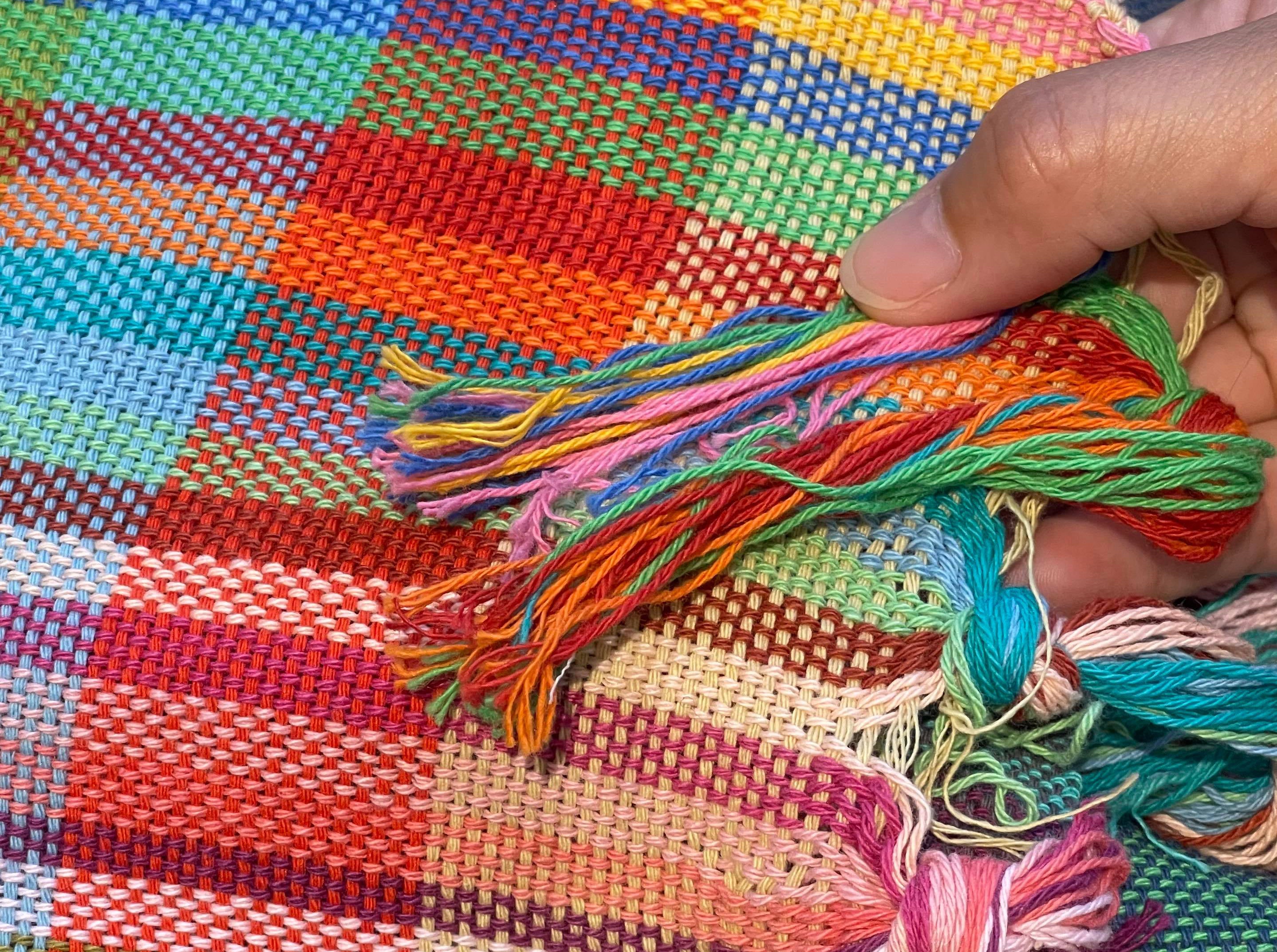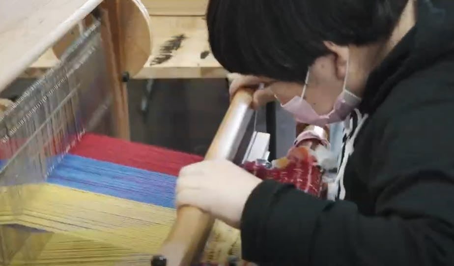 裁断した廃材布を横糸として使い、studio FLATのアーティストがさをり織りの織り機で素材・色の組み合わせや形状を考えながら、色鮮やかな反物に仕上げていきます。感性と忍耐力が必要な作業になります。
