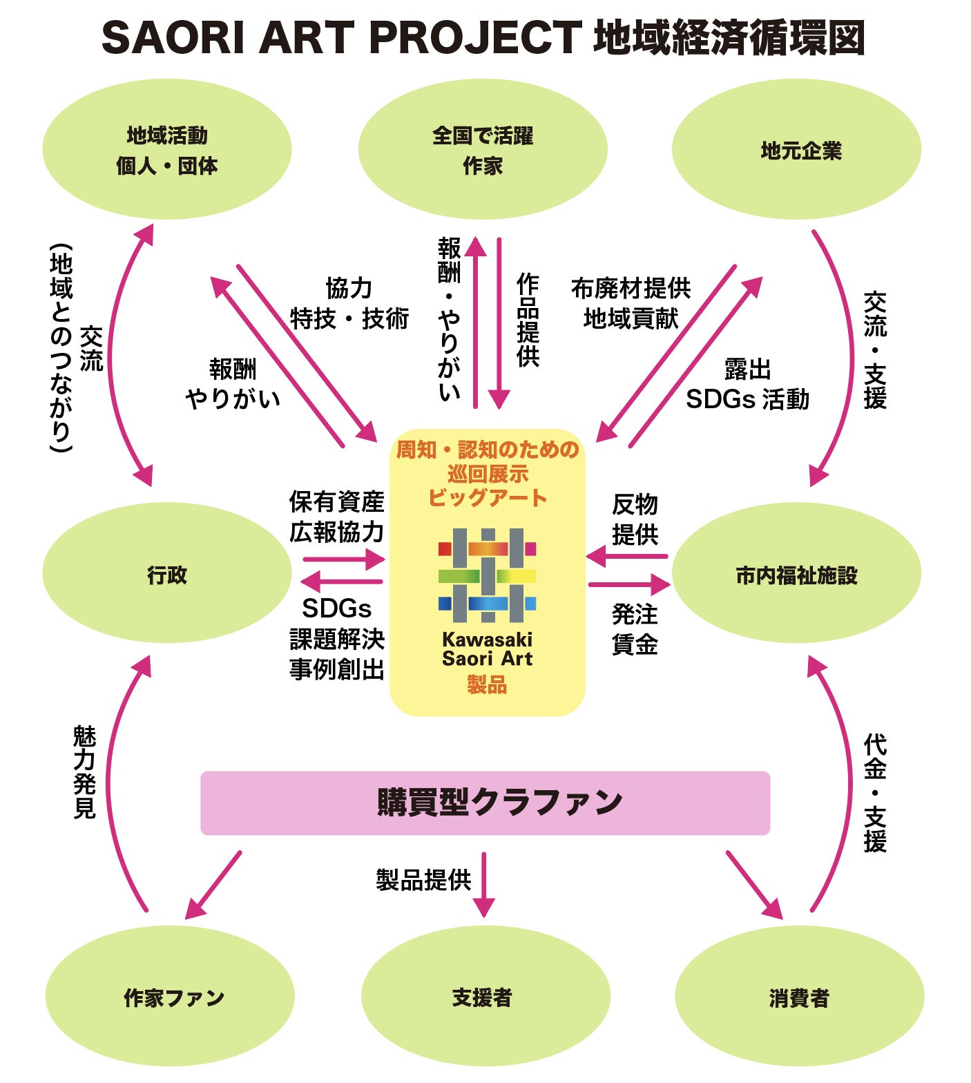 Kawasaki Saori Artプロジェクトは、資源の循環と誰もが活躍できる社会を目指した取り組みです。私たちメンバーも初めての経験で試行錯誤しながら進めています。このプロジェクトを通して障がいの有無に関わらず、持っている才能を正当な評価で相応の対価を得られる事例を積み重ねていきたいと考えます。