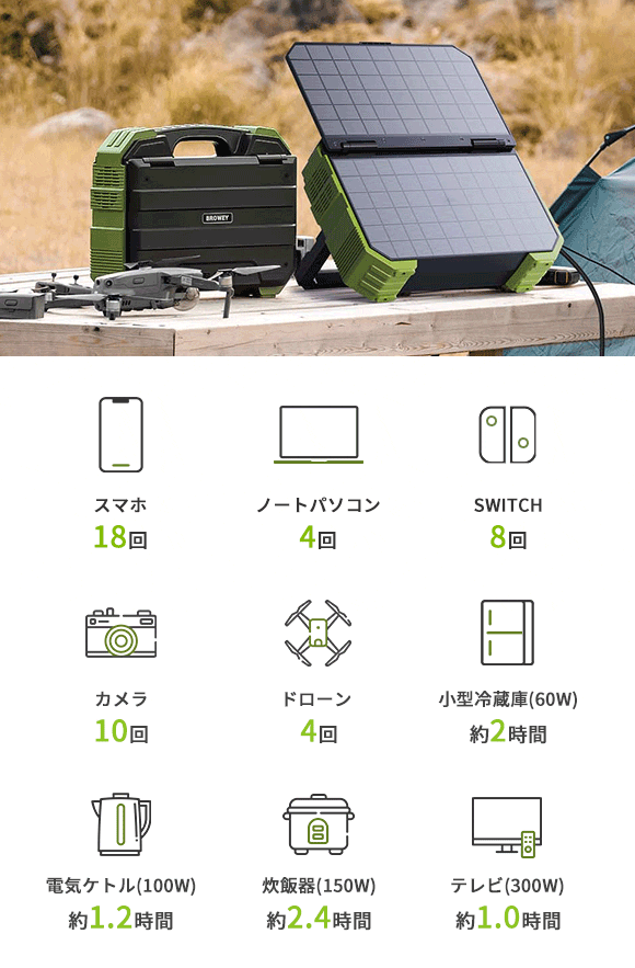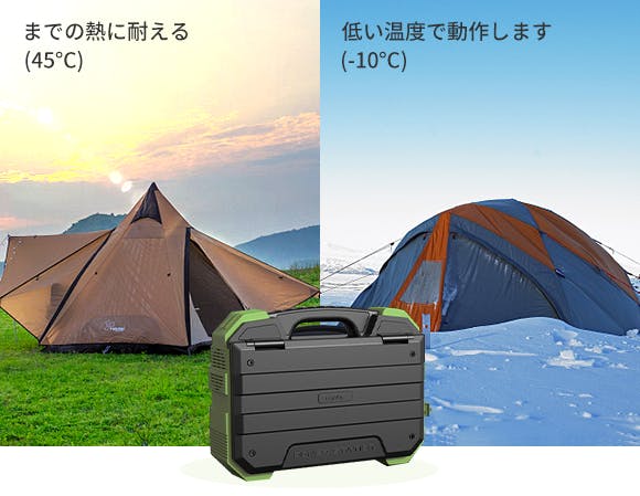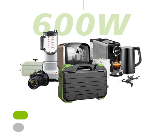 内蔵バッテリーは614Wh/192000mAhの大容量、さらに600Wの高出力ですので、パソコン、冷蔵庫、扇風機、電子レンジ、電気ケトルなど、瞬間最大出力が1200W以下の様々な電気製品に長時間給電できます。