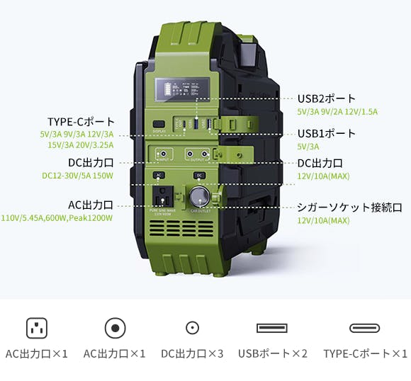 110V/600WのAC出力口を7つ搭載しており、家庭用の電気ケトル、小型冷蔵庫、プロジェクターなどにも給電可能です。アウトドアレジャーだけでなく、台風や地震などの災害時にも活躍します。