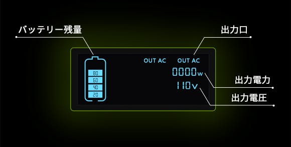 LEDディスプレイでバッテリー残量、使用中の出力口と出力状況が一目瞭然です。バッテリー残量が不足してきたら、タイミングを逃さず太陽光などで補充電できます。