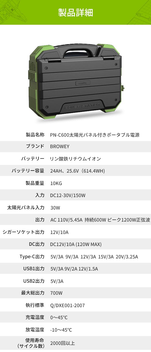 「PN-C600」は太陽光パネルが付属した多機能&高品質のポータブル電源です。太陽光パネルでバッテリーを補充電でき、エコな再生エネルギーを使用しながら1日中使用できます。内蔵バッテリーは614Wh/192000mAhの大容量、さらに600Wの高出力で、様々な電気製品に給電可能です。太陽光パネルは本体に収納できますので、片手で楽々持ち運べます。アウトドアレジャーだけでなく災害時にも、いつでもどこでも様々な電気製品が使えて便利で安心です。