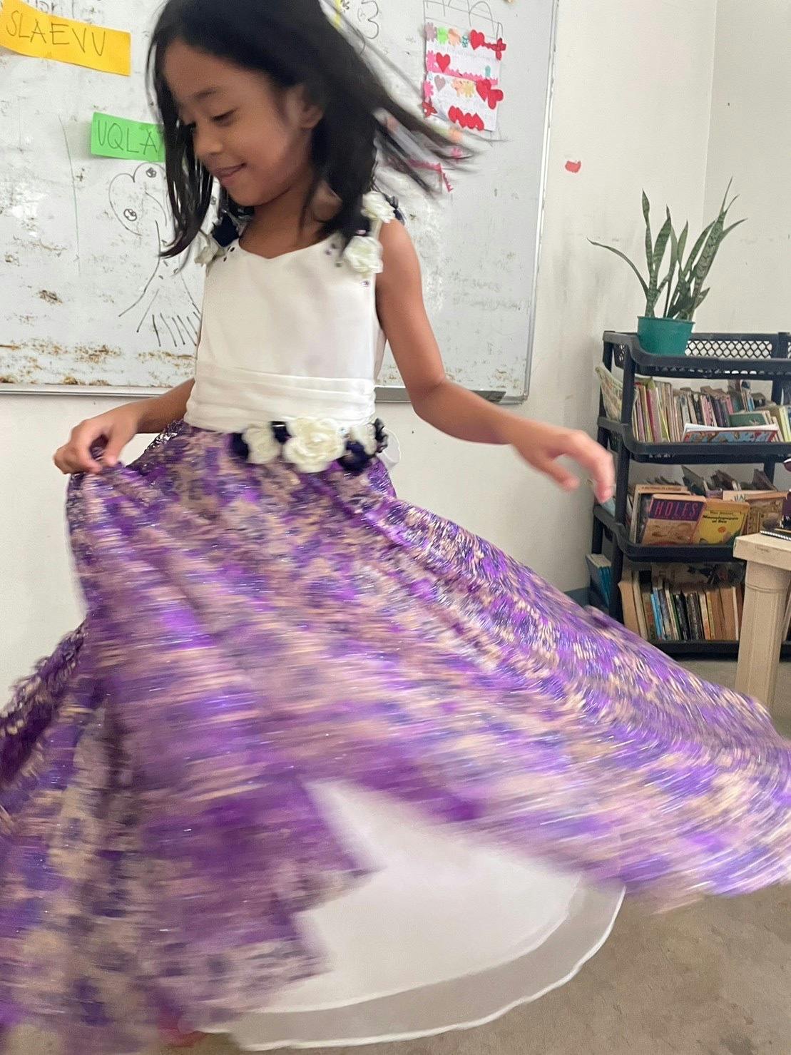 写真は、かわいい衣装を着てはしゃぐ女の子の様子です!嬉しそうにクルクル回る姿がとても愛らしいです。