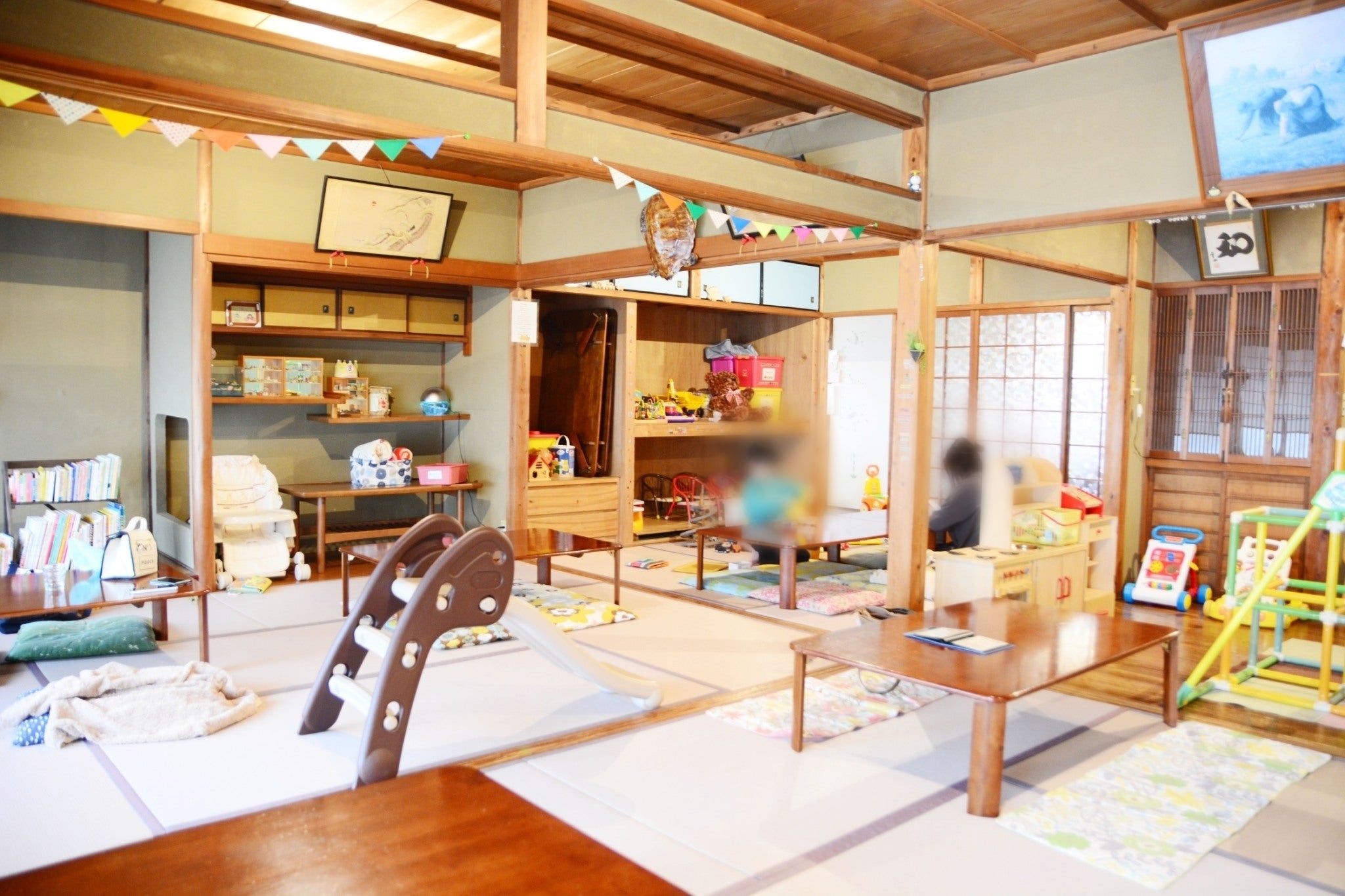 店内は広々としたお座敷の空間で、おもちゃや絵本もたくさん置いてあります。授乳やおむつ交換ができるお部屋が用意されていたり、手洗い場やトイレには踏み台も置いてあったり、子ども連れには嬉しいポイントがたくさんです。