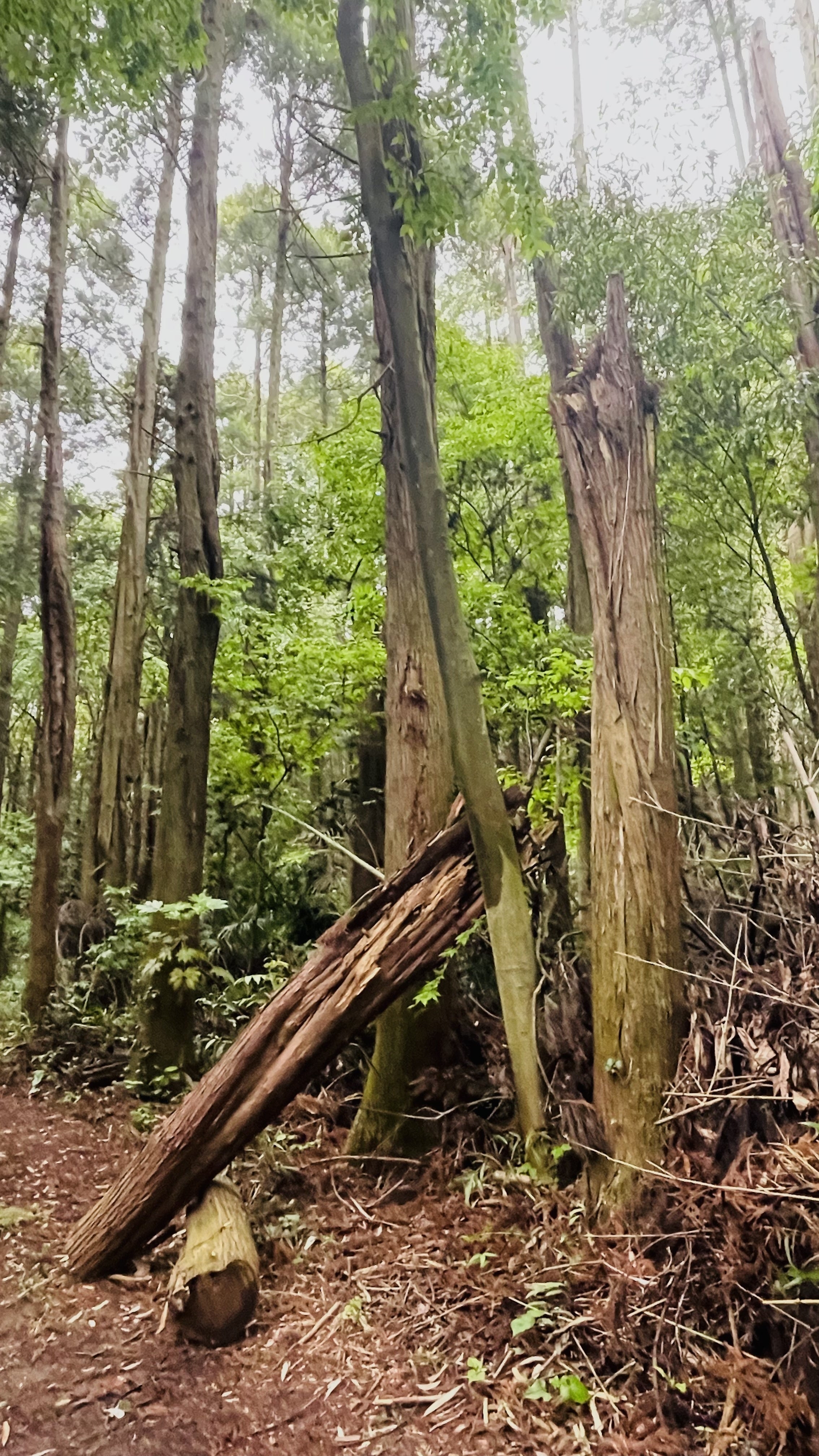 雨止んだと思って、気になる木を見に見に森に来たんですが、以前道を塞いでいた倒木を撤去した時に切れないまま元木にぶら下がっていた切れ端(と言うにはデカいんですが)が、ついに落ちてきていました。