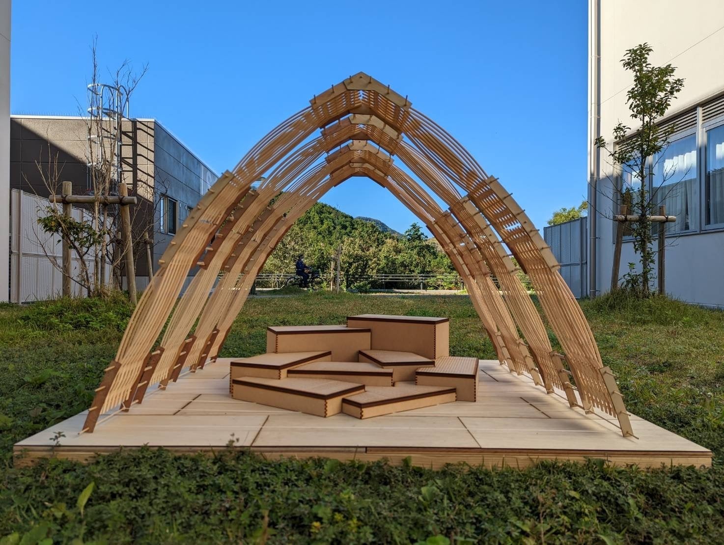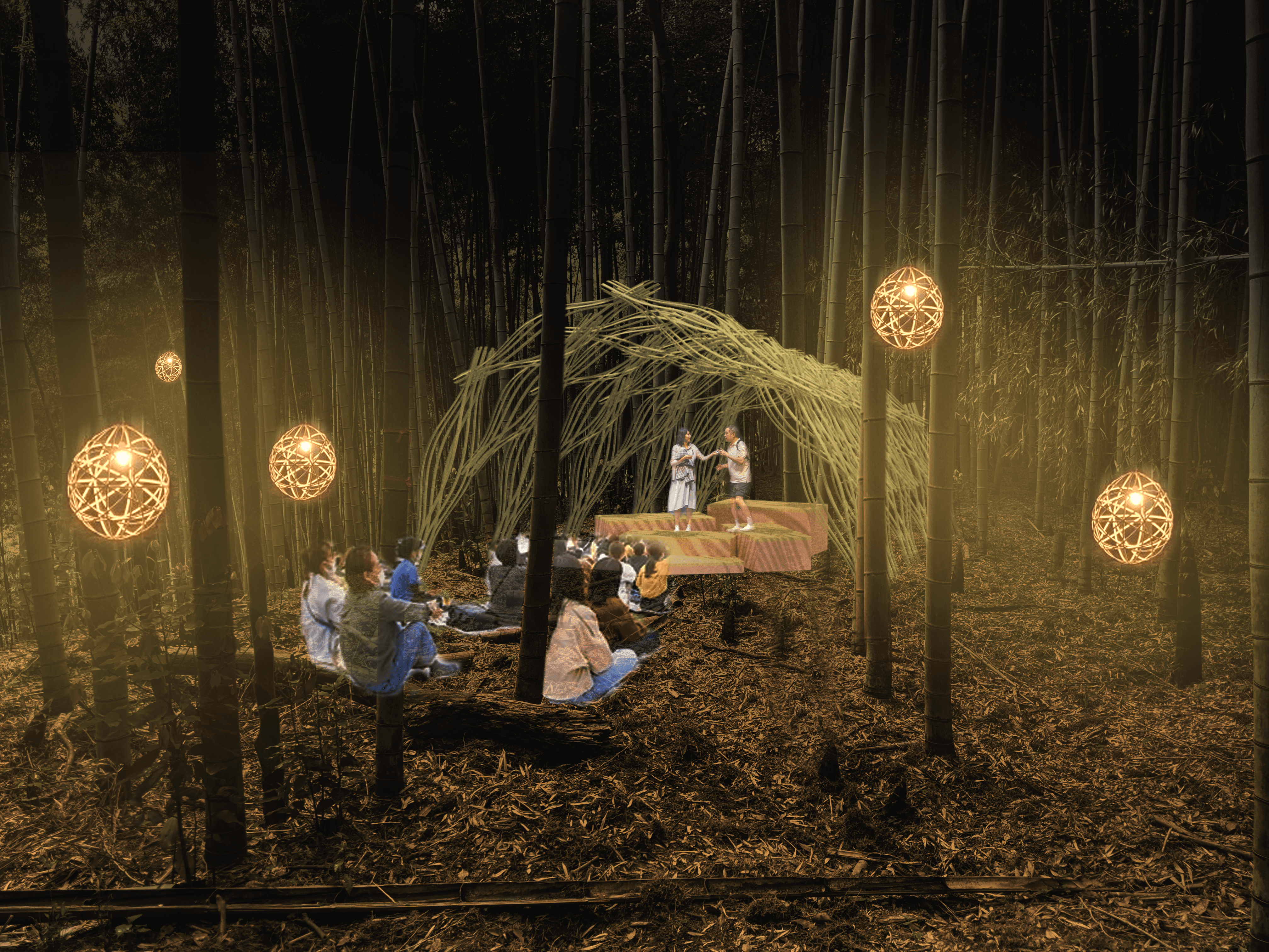 (原) 竹の素材としてのポテンシャルに向き合い、竹林の空間の魅力を最大限に引き出すことを目指して、ステージの設計に取り組みました。学部時代からの研究テーマとして取り組んできた竹建築の研究の集大成となっています。竹林の中に建つ竹のステージとそこで行われる演劇作品を是非お楽しみください!