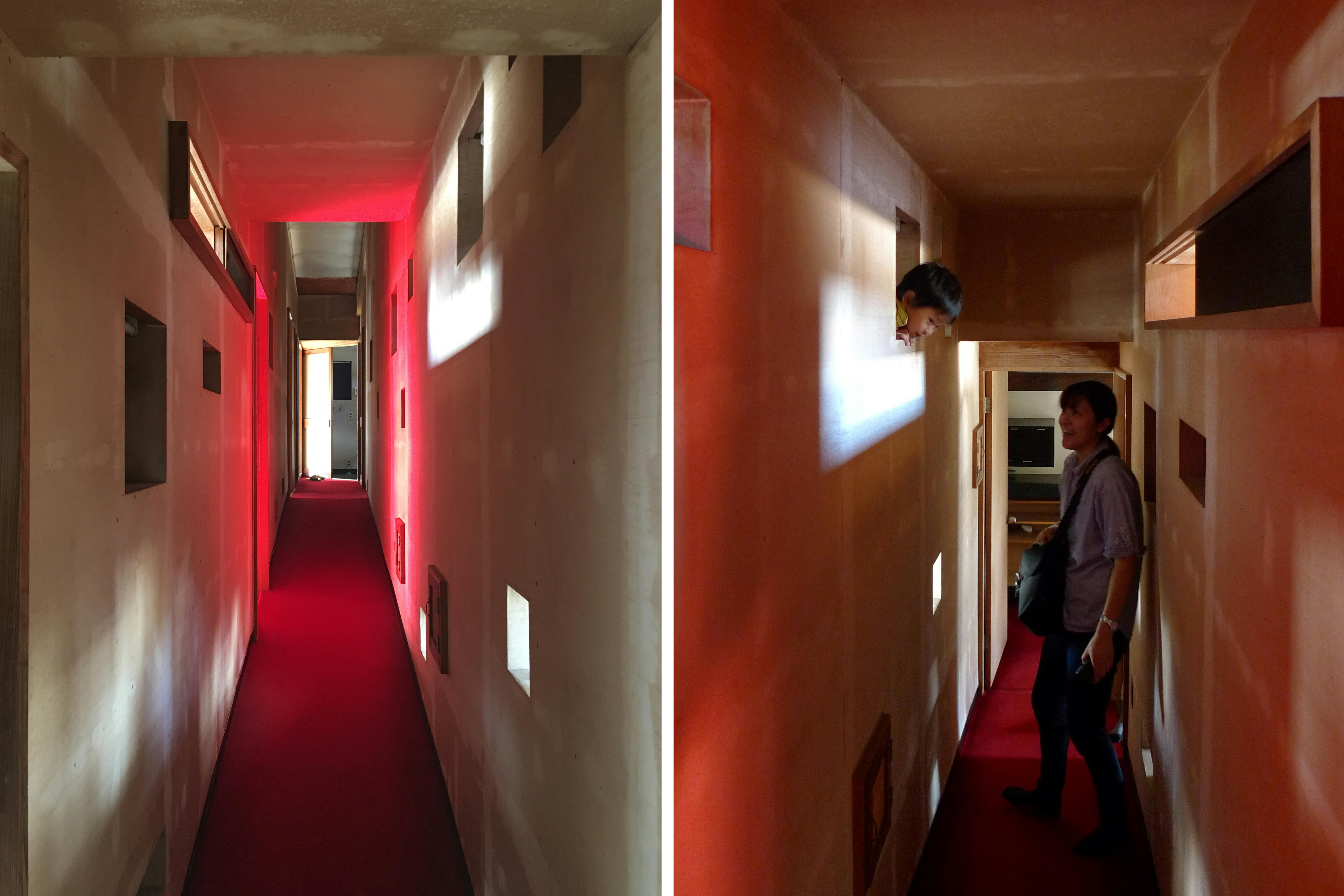 【左:光の効果が美しい斜めの家の斜路 / 右:様々な床高からの視線が交差する空間】