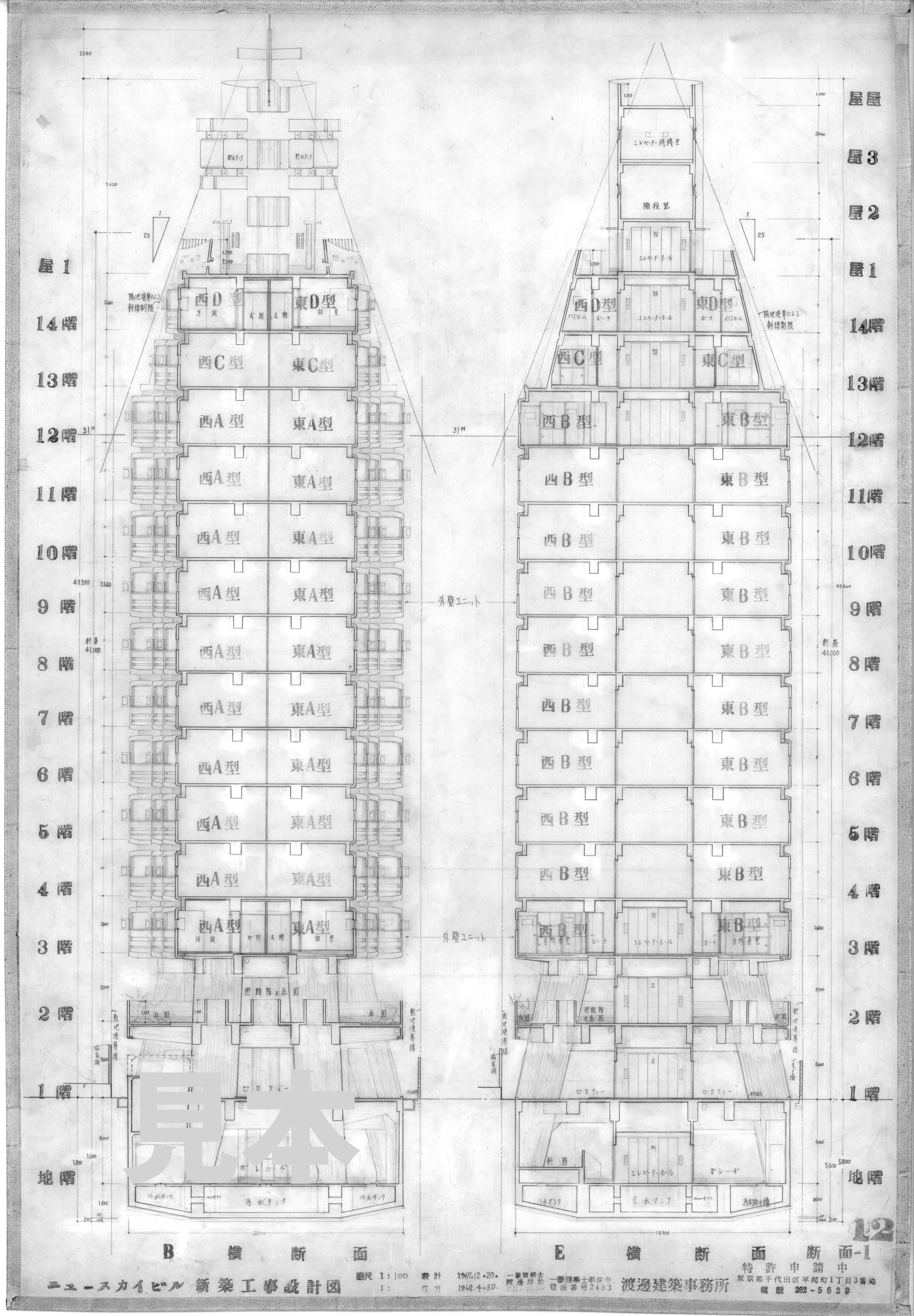 【左:斜めの家と渡邊洋治 / 右:第三スカイビル(鉄のマンション)現GUNKAN東新宿ビル】