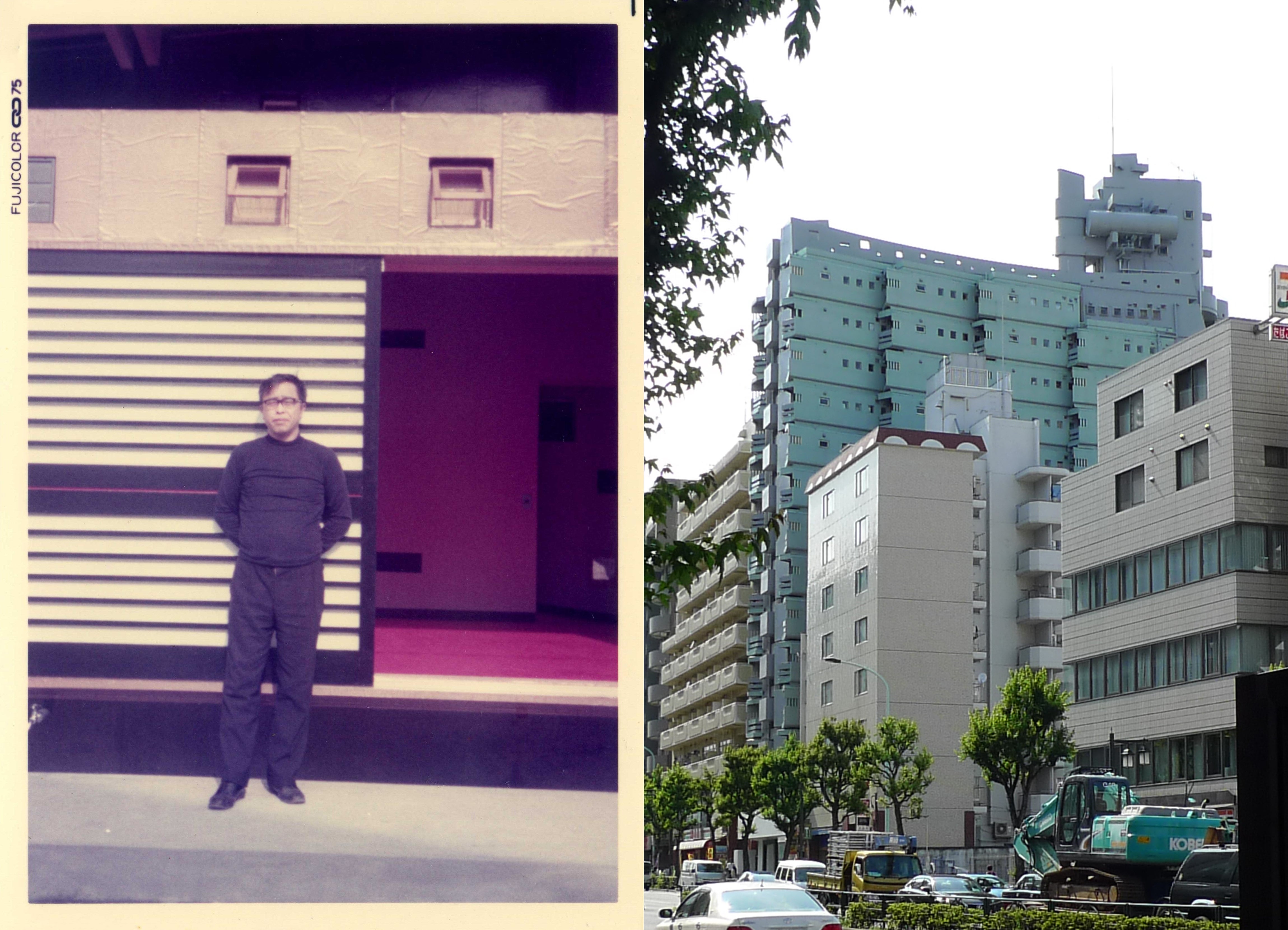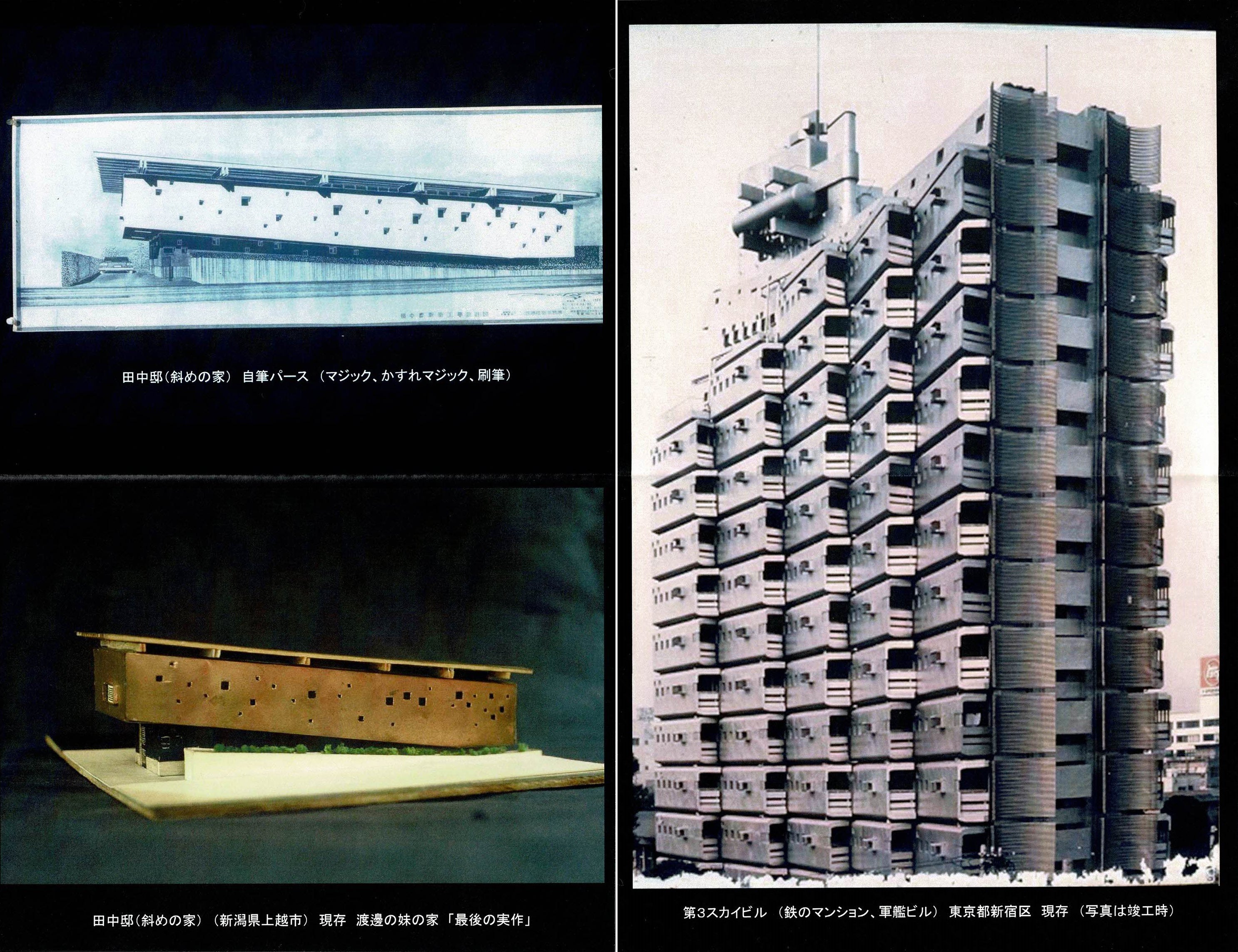 【左:斜めの家と渡邊洋治 / 右:第三スカイビル(鉄のマンション)現GUNKAN東新宿ビル】