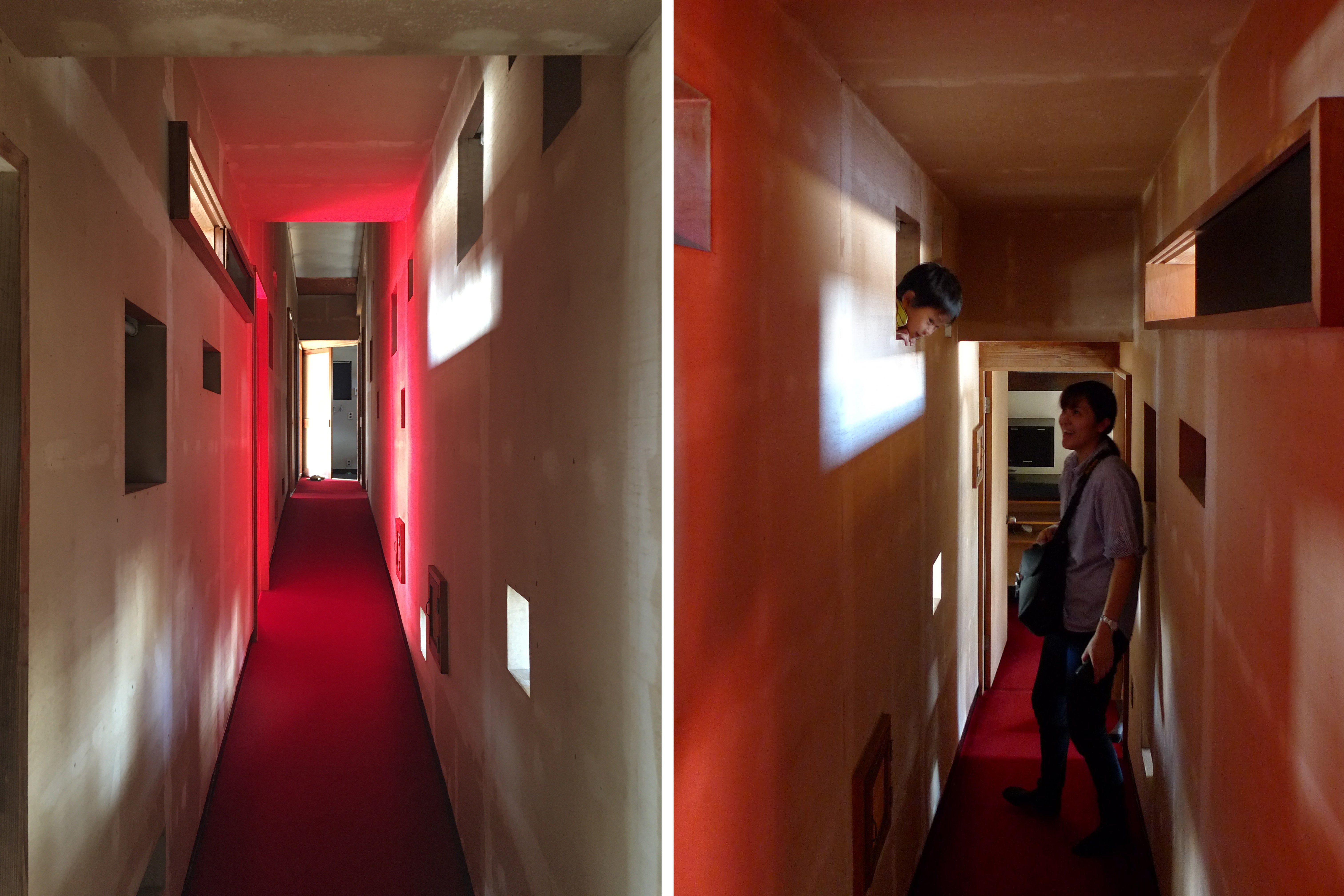 【左:光の効果が美しい斜めの家の斜路 / 右:様々な床高からの視線が交差する空間】