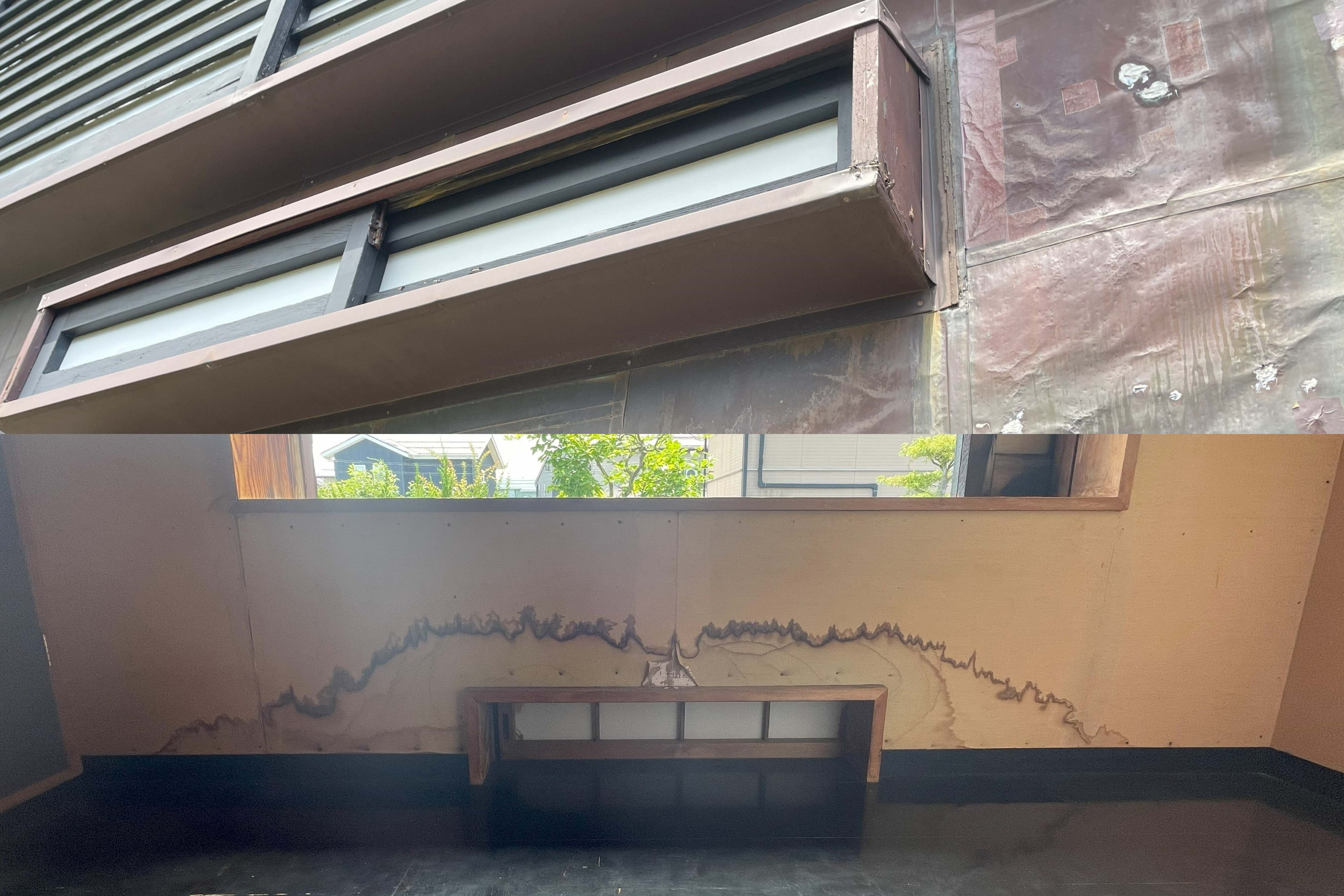 【上:問題のある小窓外部 / 下:小窓内部への雨の侵入】
