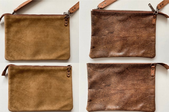 表面の野生味あふれる革、裏面はきめ細かい上品なスエードを使えるのはクーズー本革の特徴ならでは。