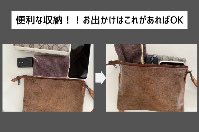 携帯、長財布、車の鍵、タオルなど収納可能です。